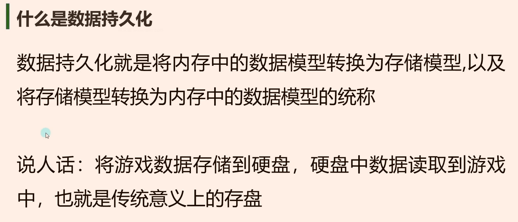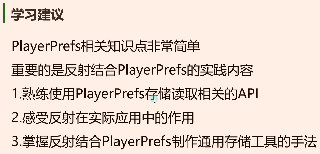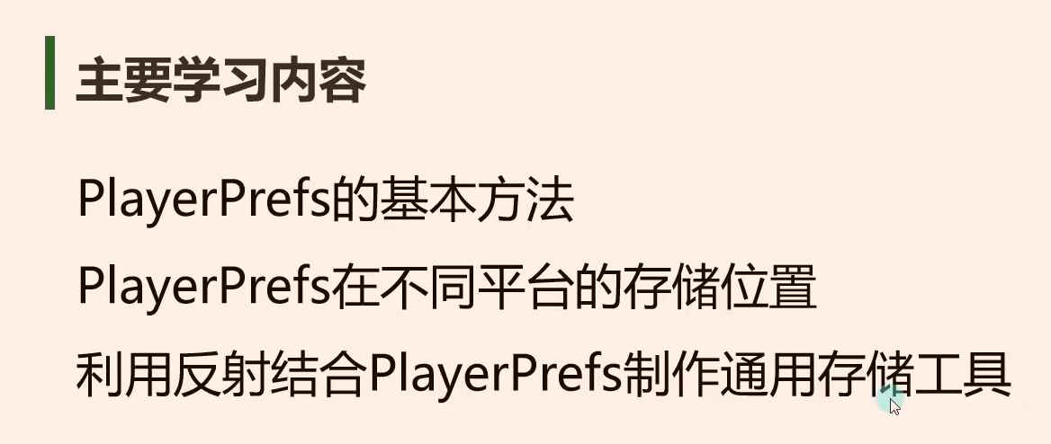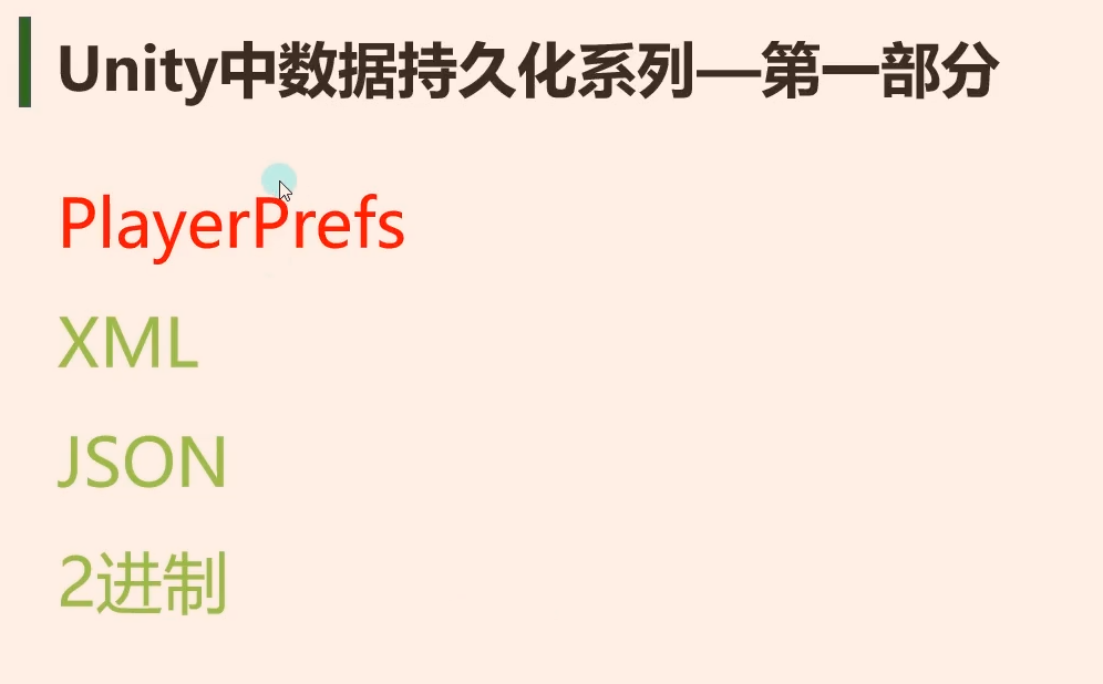 1.PlayerPrefs基础知识概述 数据工程 > 数据持久化 > Unity数据持久化 > PlayerPrefs > PlayerPrefs基础知识 数据工程 数据持久化 Unity数据持久化 PlayerPrefs PlayerPrefs基础知识 发布时间 : 2024-02-25 14:41 字数:32 阅读 : 评论: 1.概述1.1 知识点什么是数据持久化主要学习内容主要学习方式学习建议 1.概述 1.1 知识点 什么是数据持久化 主要学习内容 主要学习方式 学习建议 转载请注明来源,欢迎对文章中的引用来源进行考证,欢迎指出任何有错误或不够清晰的表达。可以在下面评论区评论,也可以邮件至 785293209@qq.com