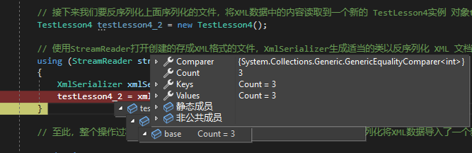 // 至此,整个操作过程完成,TestLesson4 对象已被序列化为XML,再通过反序列化将XML数据导入了一个新的TestLesson4实例对象testLesson4_2中。