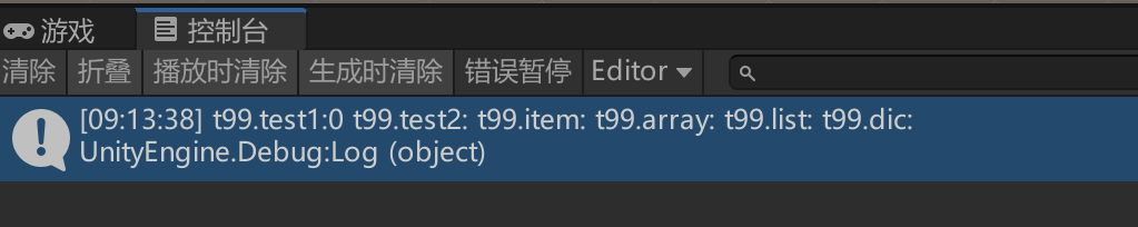 Debug.Log($"t99.test1:{t99.test1} t99.test2:{t99.test2} t99.item:{t99.item} t99.array:{t99.array} t99.list:{t99.list} t99.dic:{t99.dic}");