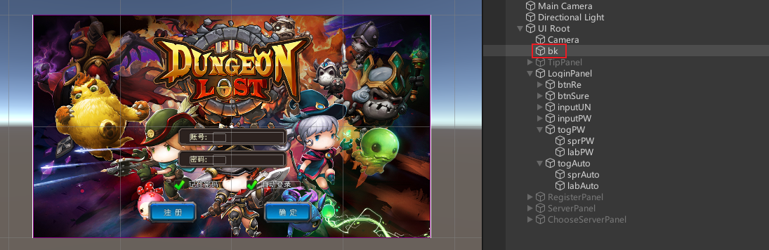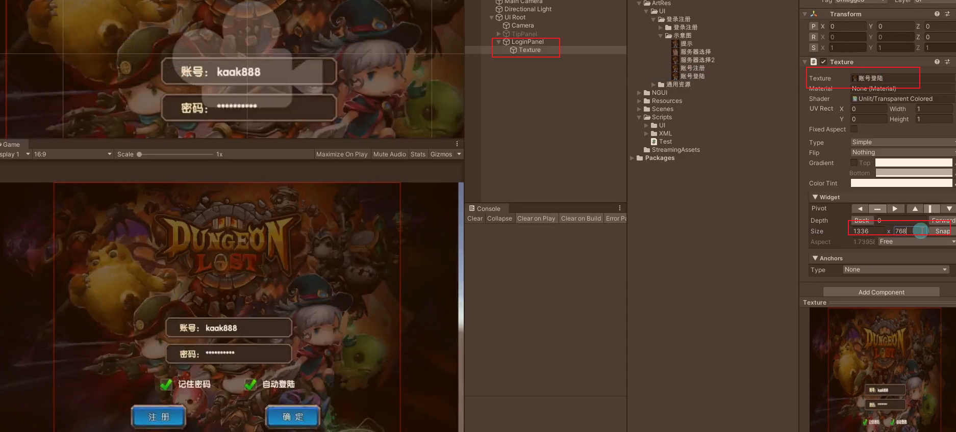 创建一个Panel取名为LoginPanel,LoginPanel下创建一个Texture作为面板的底图,拖拽登录面板示意图,对着来拼