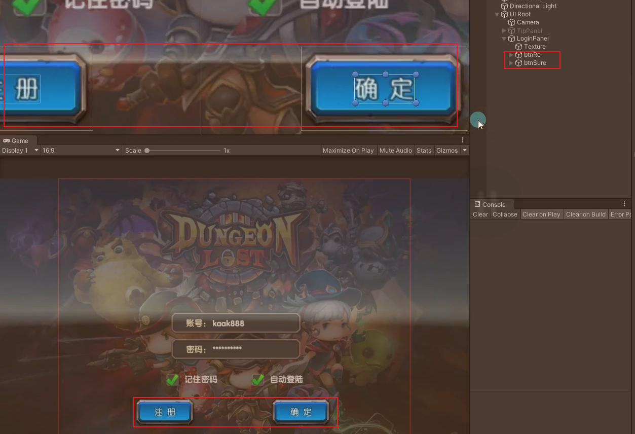 创建两个Sprite,选择登录按钮通用背景作为图片,调整切片模式九宫格透明度大小宽高锚点等,作为注册按钮和确定按钮背景的同时当做注册按钮对象和确定按钮对象,注意层级。再分别创建一个Sprite作为注册按钮和确定按钮背景子物体,选择注册图片和确定图片,注意层级。给注册按钮和确定按钮添加NGUI碰撞体和Button脚本。