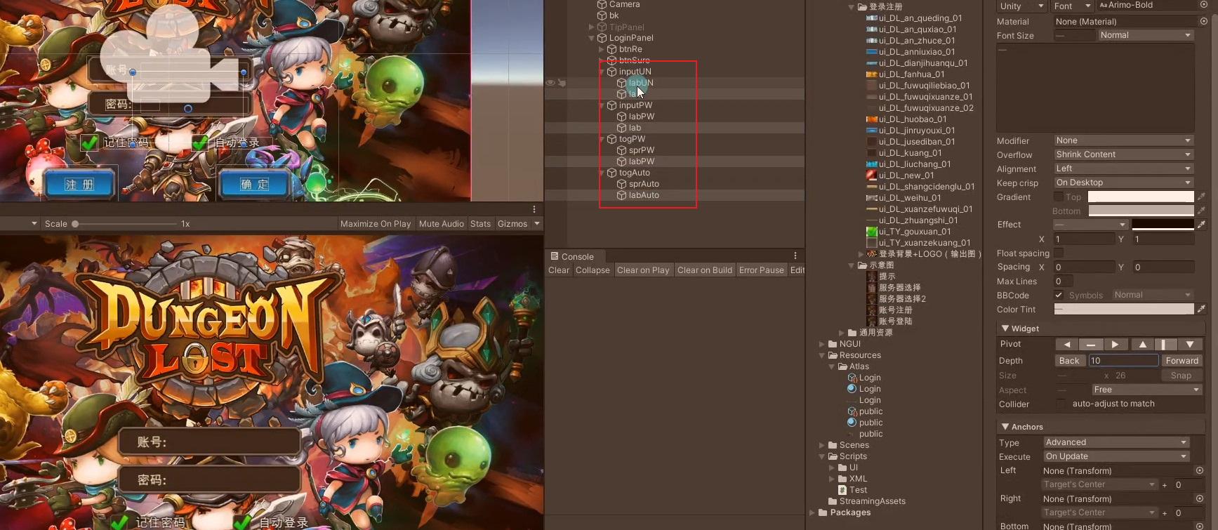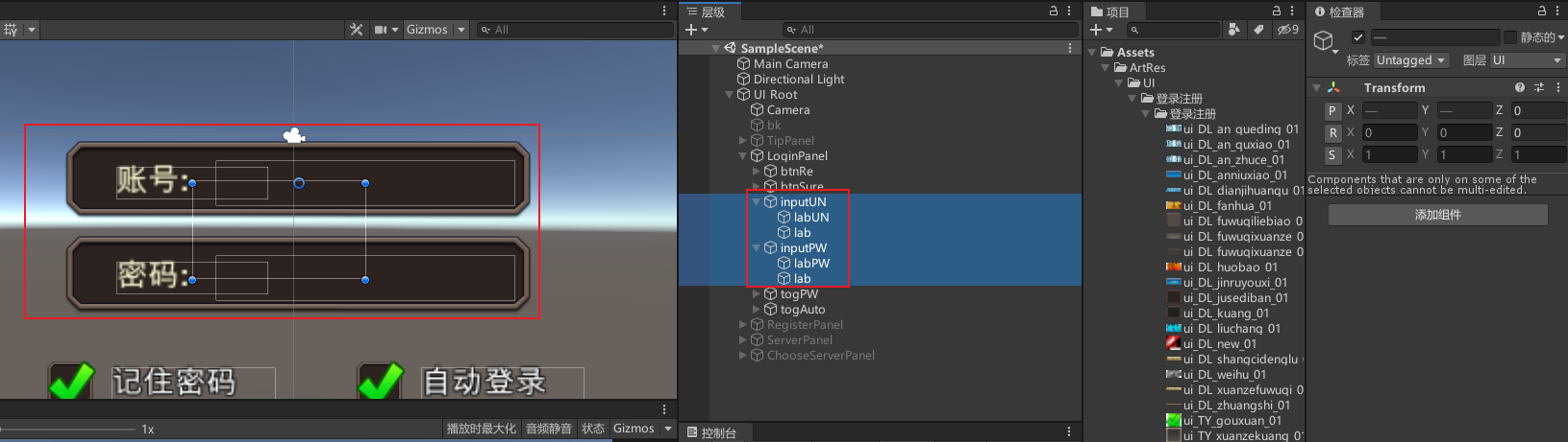 创建两个输入框。分别是账号和密码。步骤是先创建一个Sprite在创建一个Label子物体。Sprite添加InputField脚本关联子物体Label。Sprite添加NGUI碰撞器。设置是否密码显示,输入字符限制,最大长度限制等。