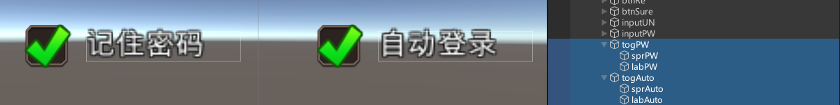 创建两个多选框。分别是记住密码和自动登录。步骤是先创建一个Sprite在创建一个Sprite子物体。Sprite父对象添加Toggle脚本关联子物体Sprite。Sprite添加NGUI碰撞器。再给父对象Sprite添加一个Label进行多选框信息说明。