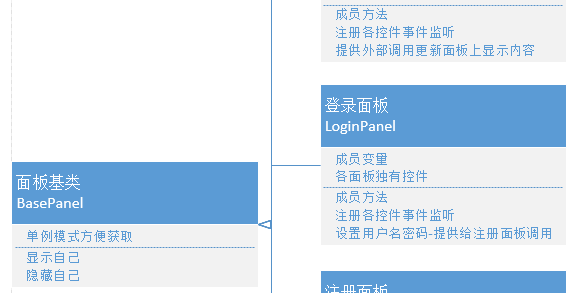创建提示面板LoginPanel脚本,继承面板基类。创建提示面板自身的成员变量账号密码输入框,注册登录按钮,记住密码和登录多选框,并在Inspector窗口关联。