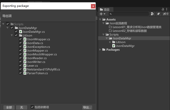 导出包的时候要把LitJson文件夹也导出,因为我们写的Json数据管理类用了LitJson