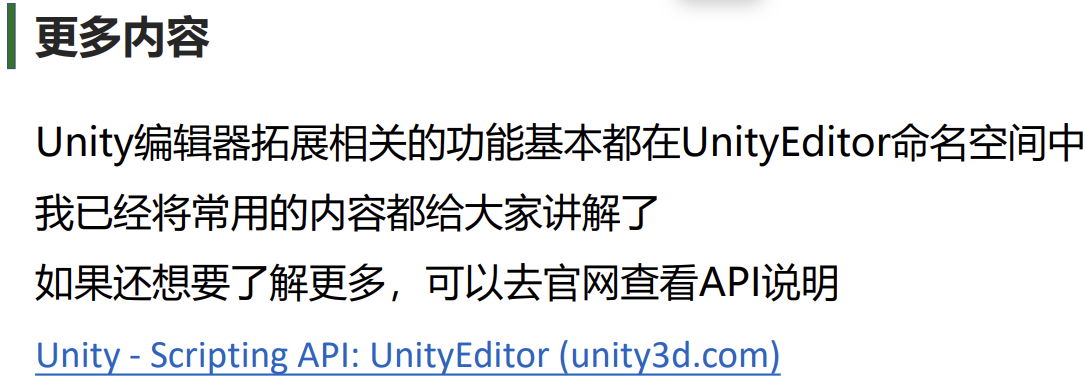 - EditorGUILayout:自动布局,与 GUILayout 对应,多数工具窗、Inspector 拓展用 EditorGUILayout 写控件更省事。