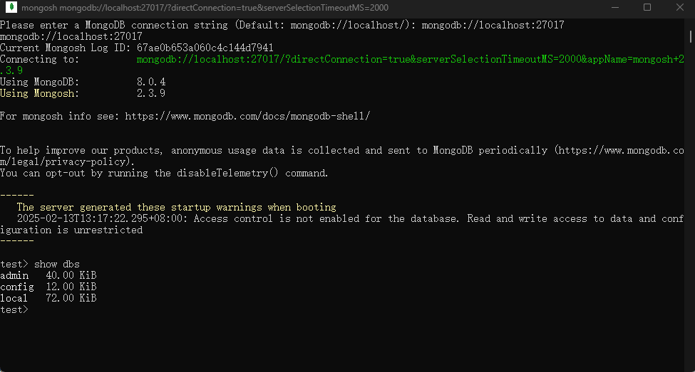 启动后,Shell 会提示你输入一个 MongoDB 连接字符串。