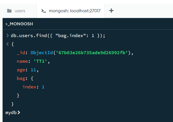 db.users.find({ "bag.index": 1 });