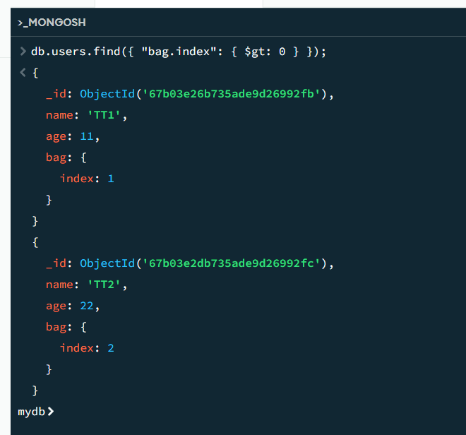 db.users.find({ "bag.index": { $gt: 0 } });