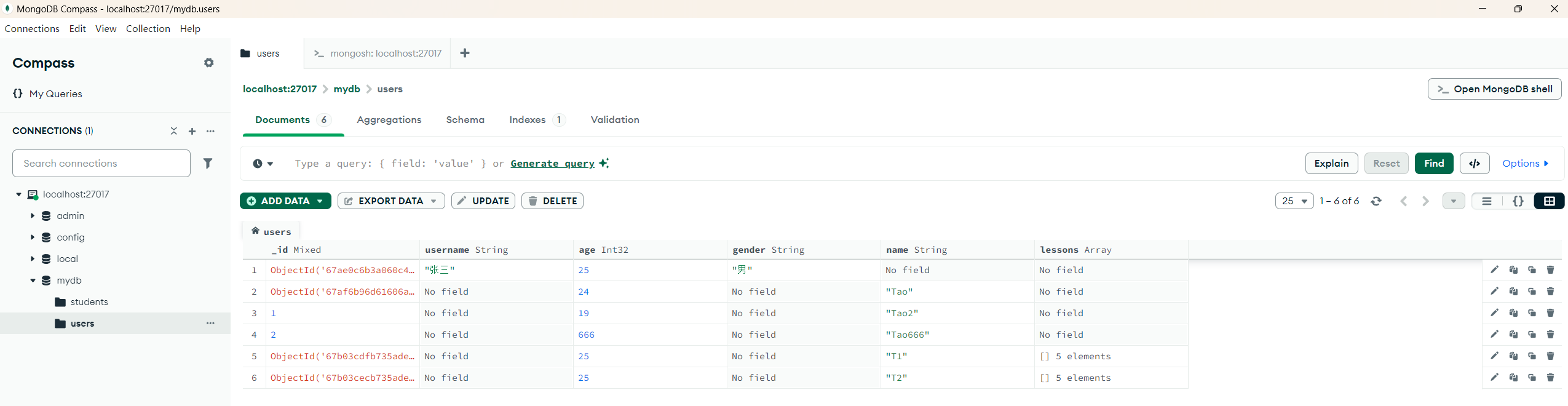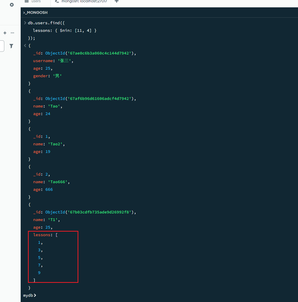 # 插入一个新的数据,并且增加一个 lessons 数组字段