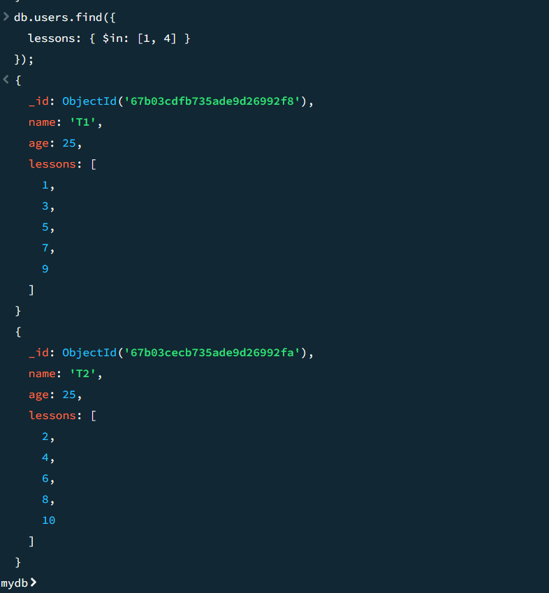 # 查询 lessons 数组中包含 1 或 4 的文档