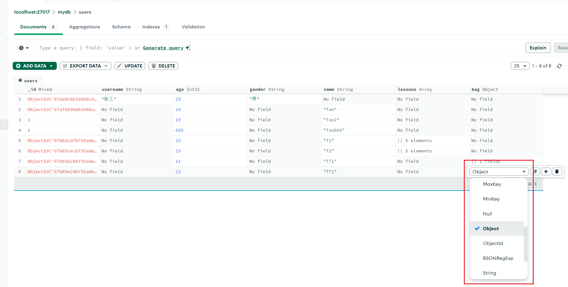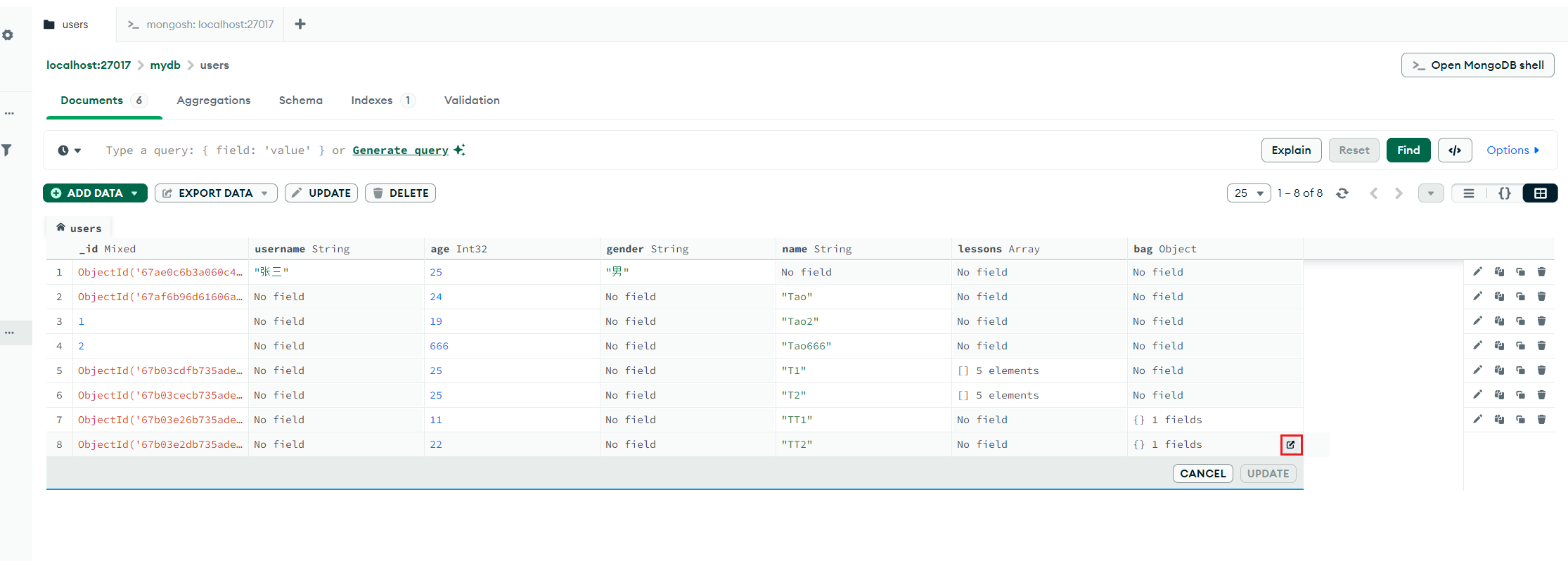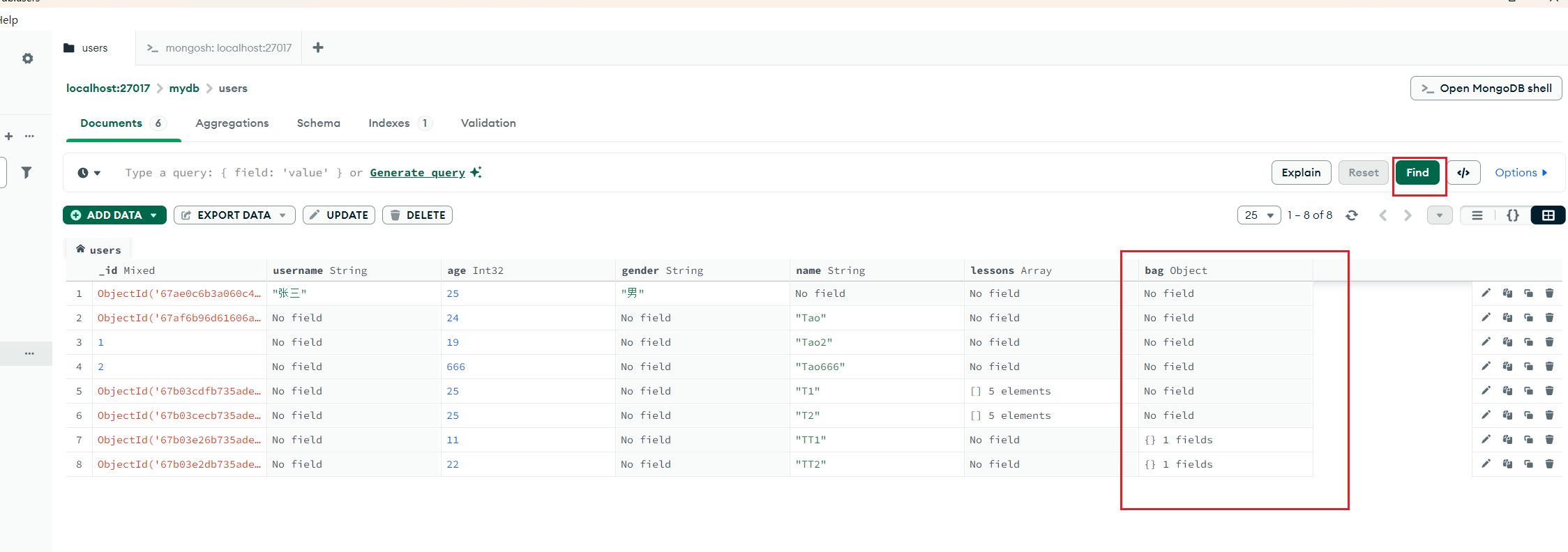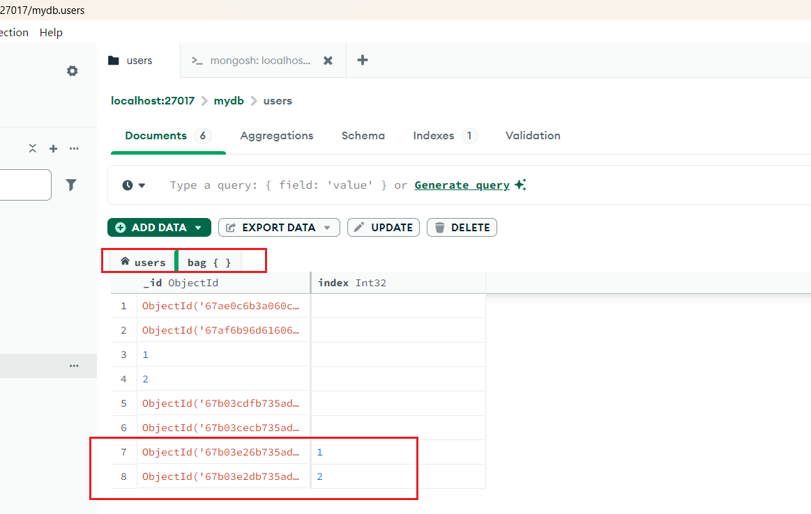 # 插入两条带 bag 对象的数据