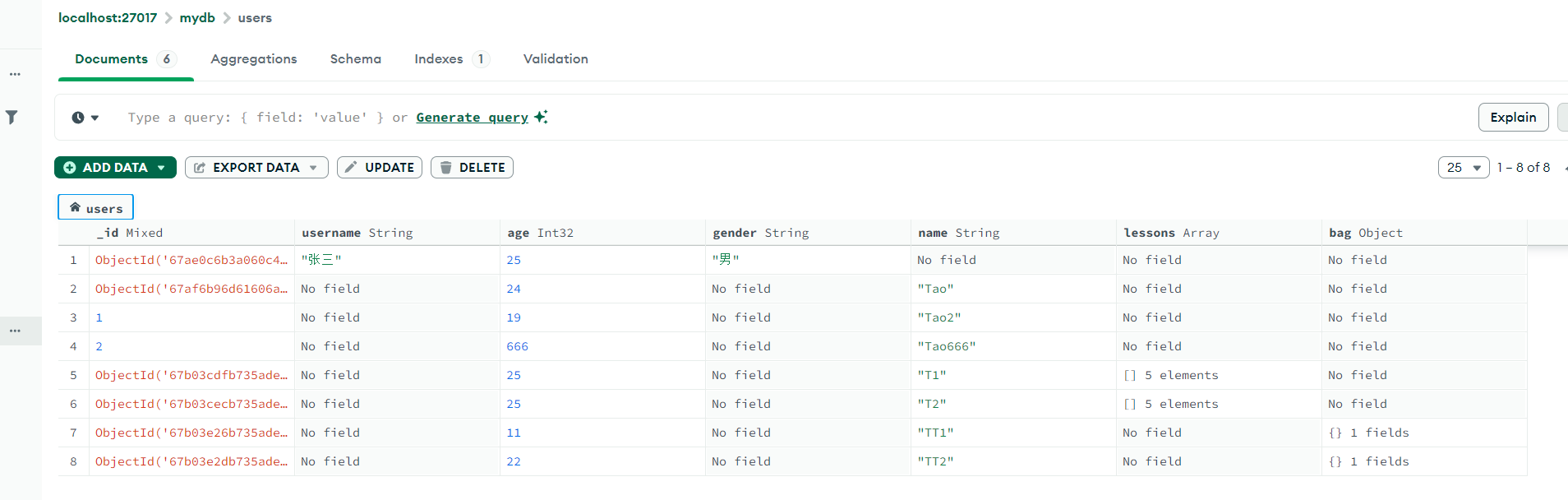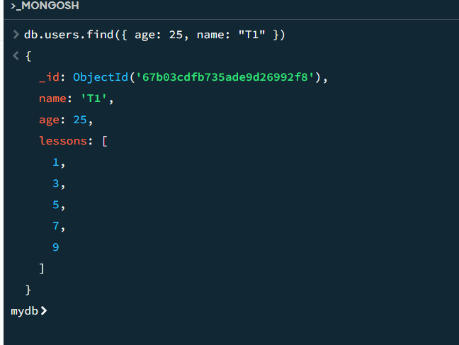 要查询年龄为 25 且姓名为 “T1” 的文档,可以使用以下命令: