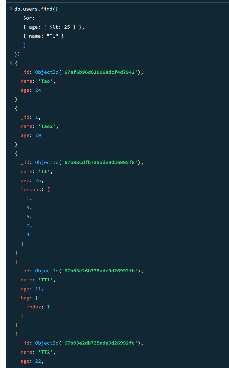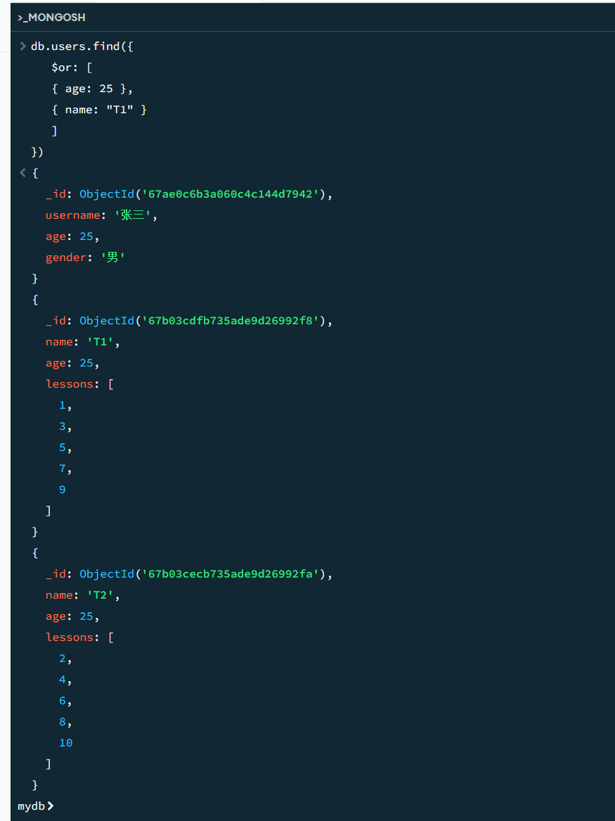 要查询年龄为 25 或姓名为 “T1” 的文档,可以使用 $or