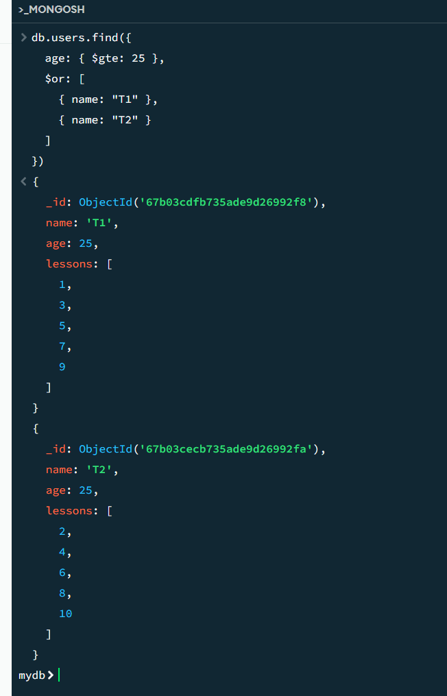 要查询年龄大于等于 25,且姓名为 “T1” 或 “T2” 的文档,可以组合使用 $and