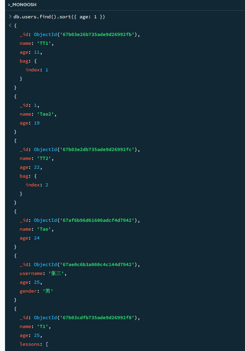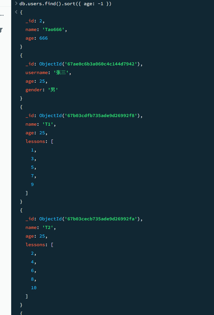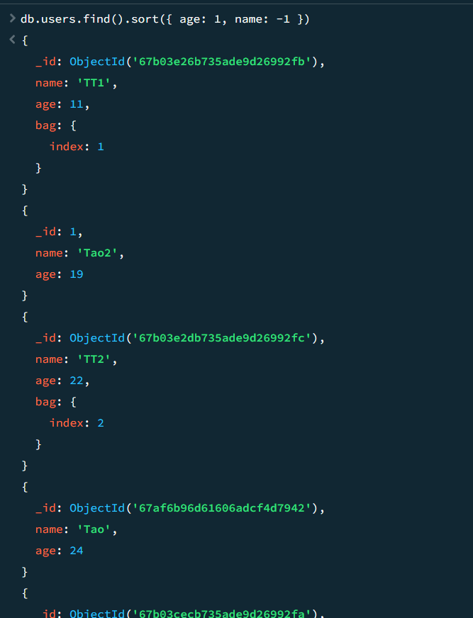 你可以按多个字段进行排序,MongoDB 会按照字段的顺序依次进行排序。如果第一个字段的值相同,才会根据第二个字段进行排序,依此类推。