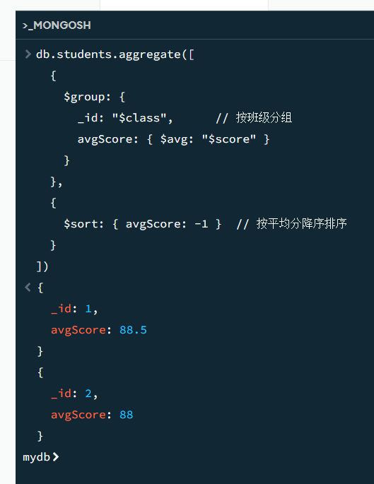 还可以与其他聚合操作符结合使用。例如,假设我们想要计算每个班级学生的平均分数,并按平均分数排序: