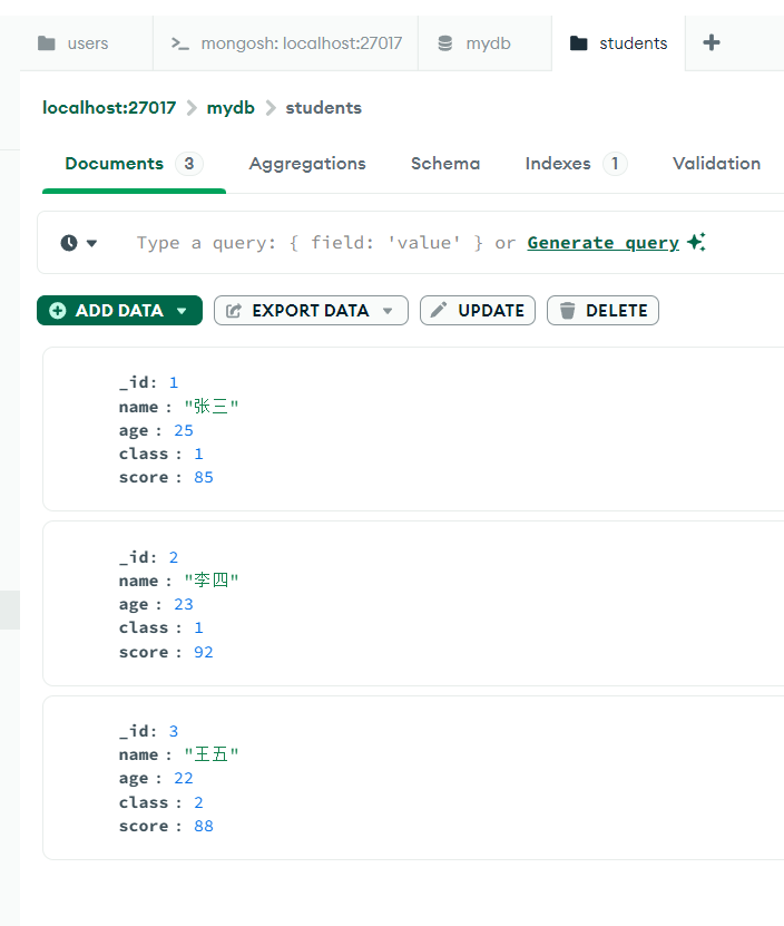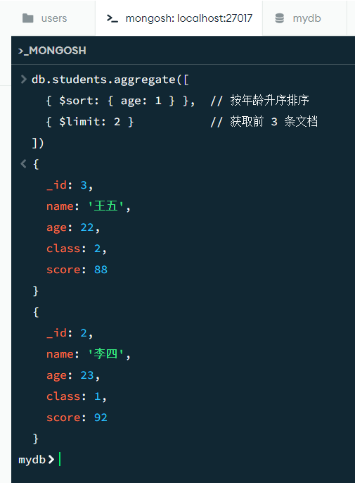 如果我们希望根据年龄排序,并获取年龄最小的前 2 条记录,可以先使用 $sort