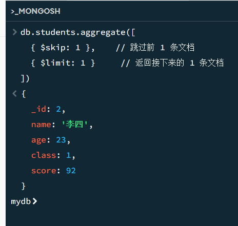 假设我们要进行分页操作,跳过前 1 条文档,然后返回接下来的 1 条。这个场景通常用 $skip