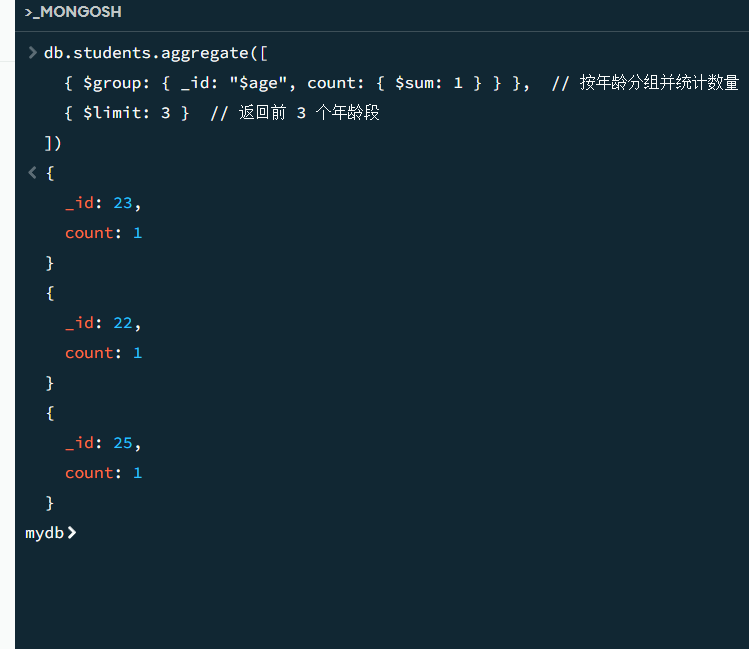 有时我们可能先做分组统计,然后限制返回的分组结果数量。例如,我们想要根据每个用户的年龄分组,对于每个年龄段,使用累加器表达式 { $sum: 1 } 统计该年龄段的学生数量,并将结果存储在 count 字段中。然后限制结果只返回前 3 个年龄段。