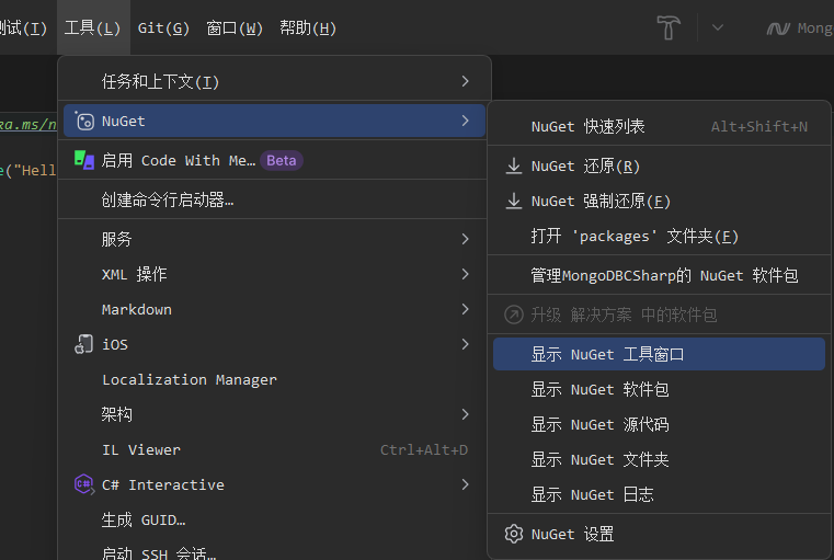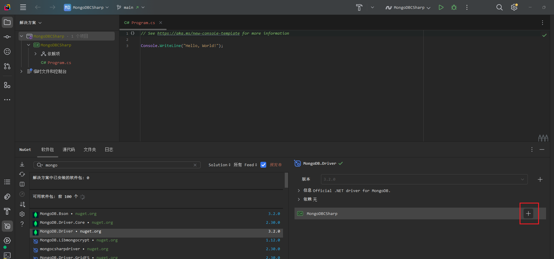 在项目中通过 NuGet 安装 MongoDB 的官方 .NET 驱动程序: