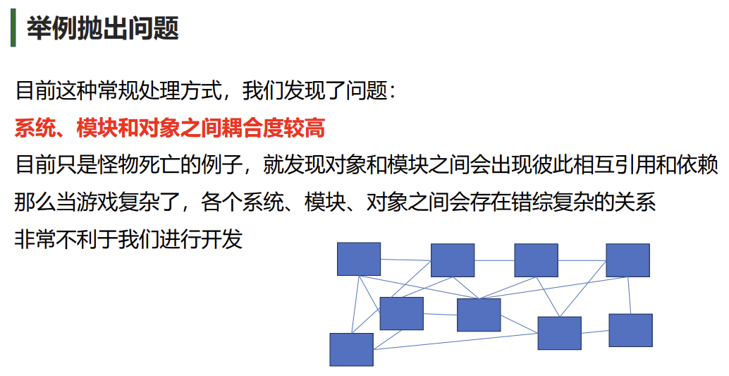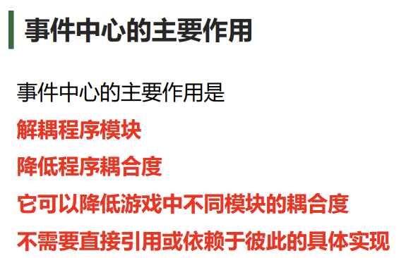 在游戏开发中,我们经常遇到这样的问题:不同模块之间需要相互通信,但直接引用会造成高耦合。