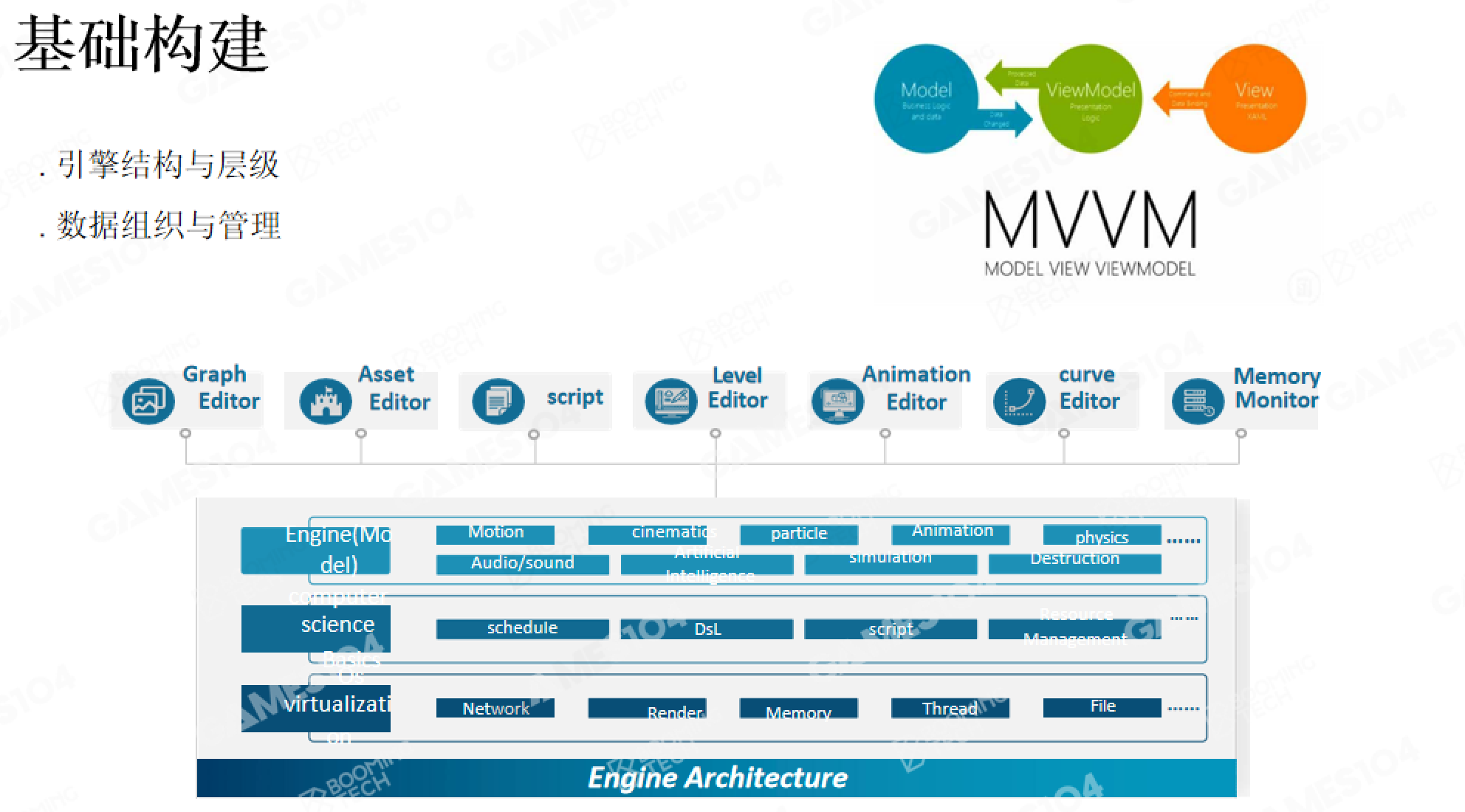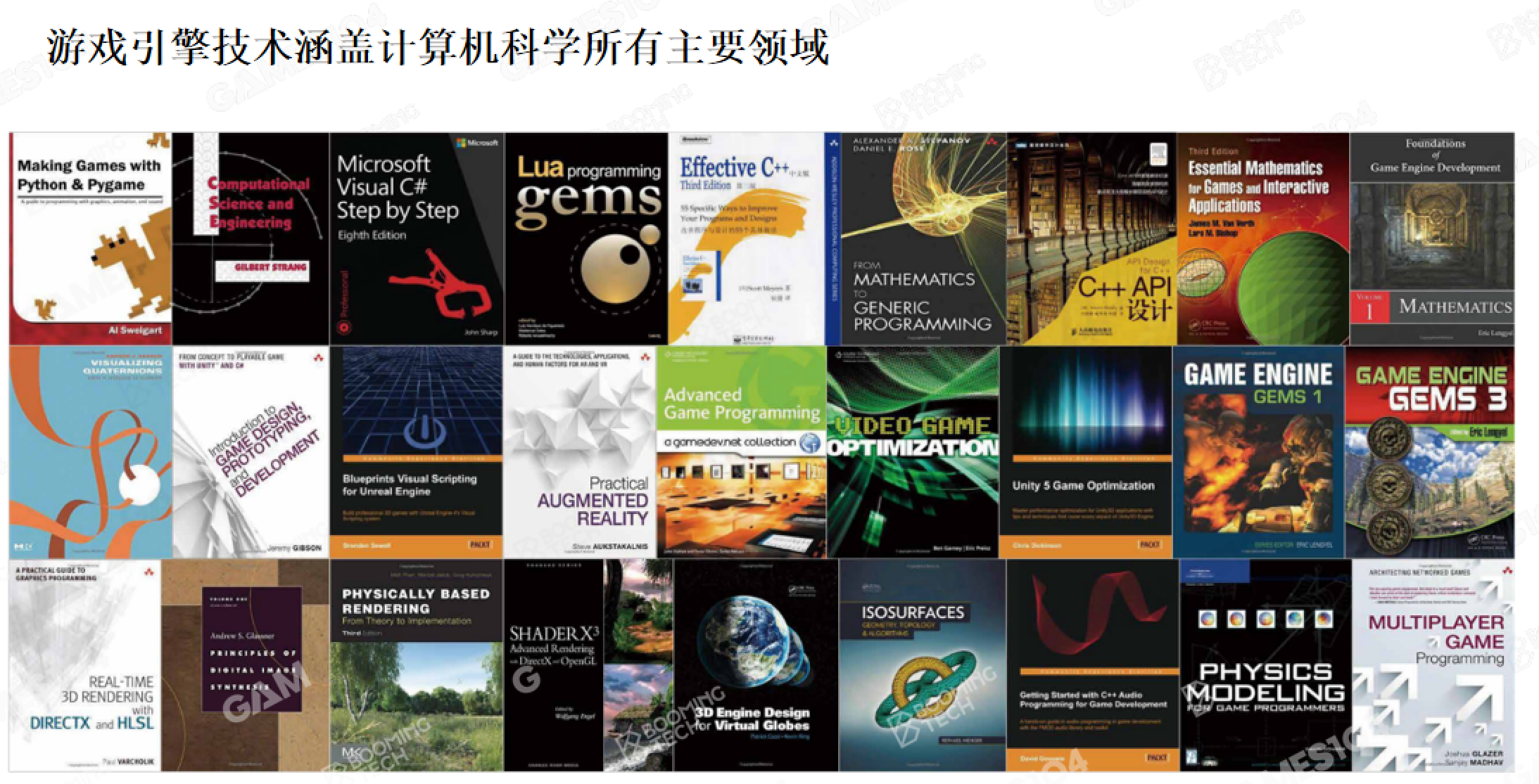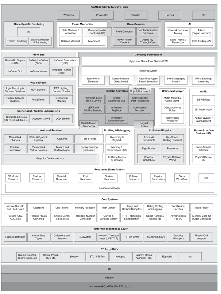 游戏引擎技术涵盖计算机科学所有主要领域知识,入门时聚焦主线以及知识框架与体系结构,不深究技术细节:
