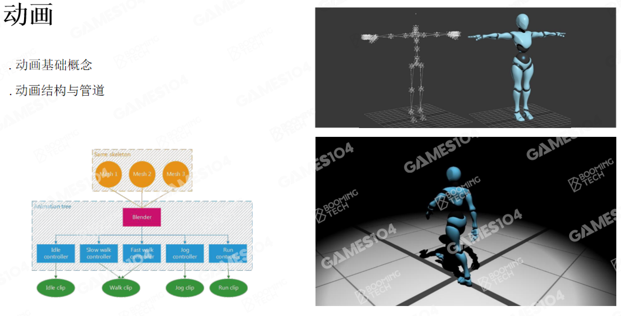 强调交互与玩法落地:动画树/Blend过渡机制、事件驱动交互(如受击打断、空手接白刃的准确性);略过Skeleton/Rigging基础,聚焦“动画素材如何变成可交互的游戏表现”。