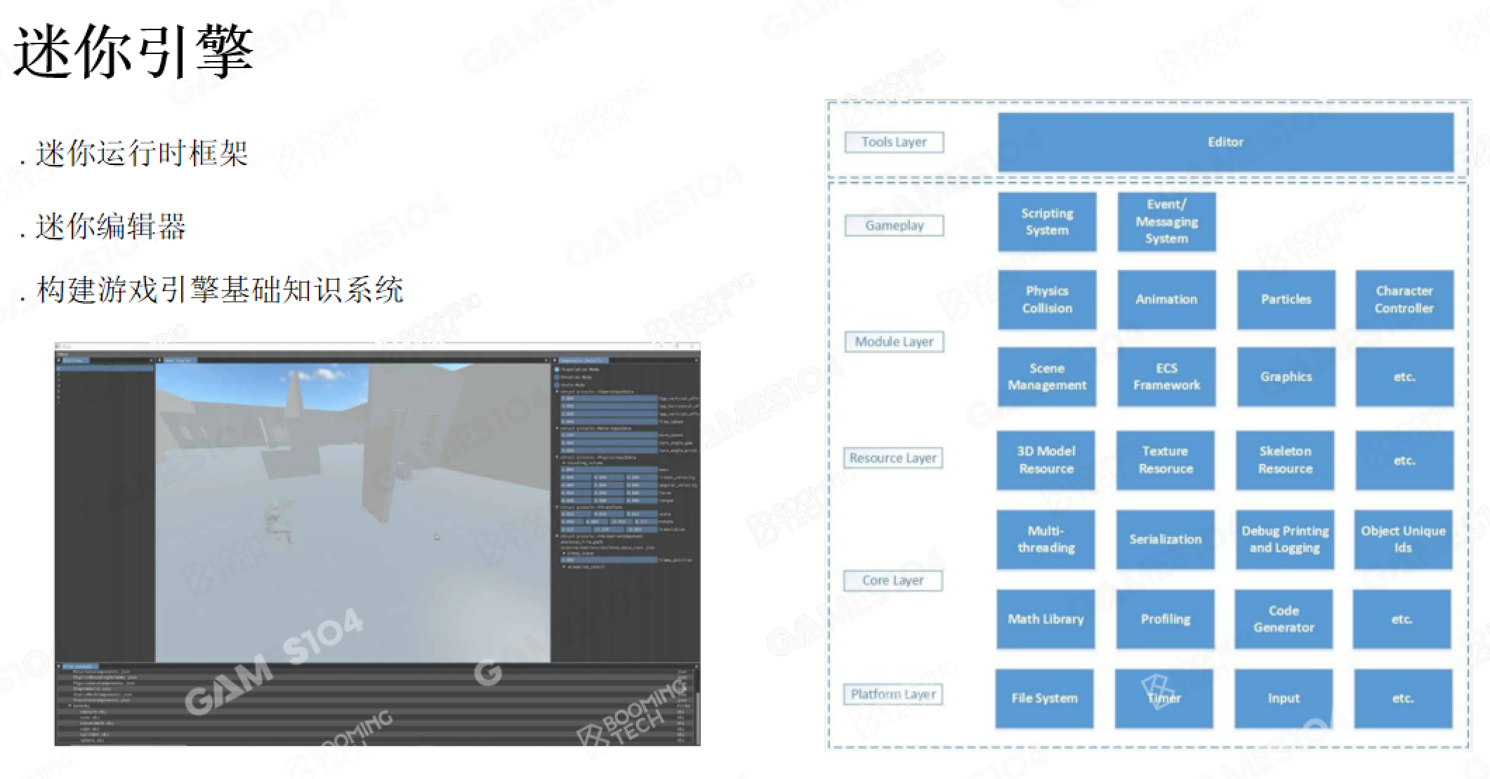 核心是引擎“骨架”搭建:主循环/Tick调度、分层架构(平台抽象→核心层→功能层)、时间/帧率管理,以及资源/场景/对象的数据组织模型,帮你建立引擎整体认知,掌握代码阅读入口。