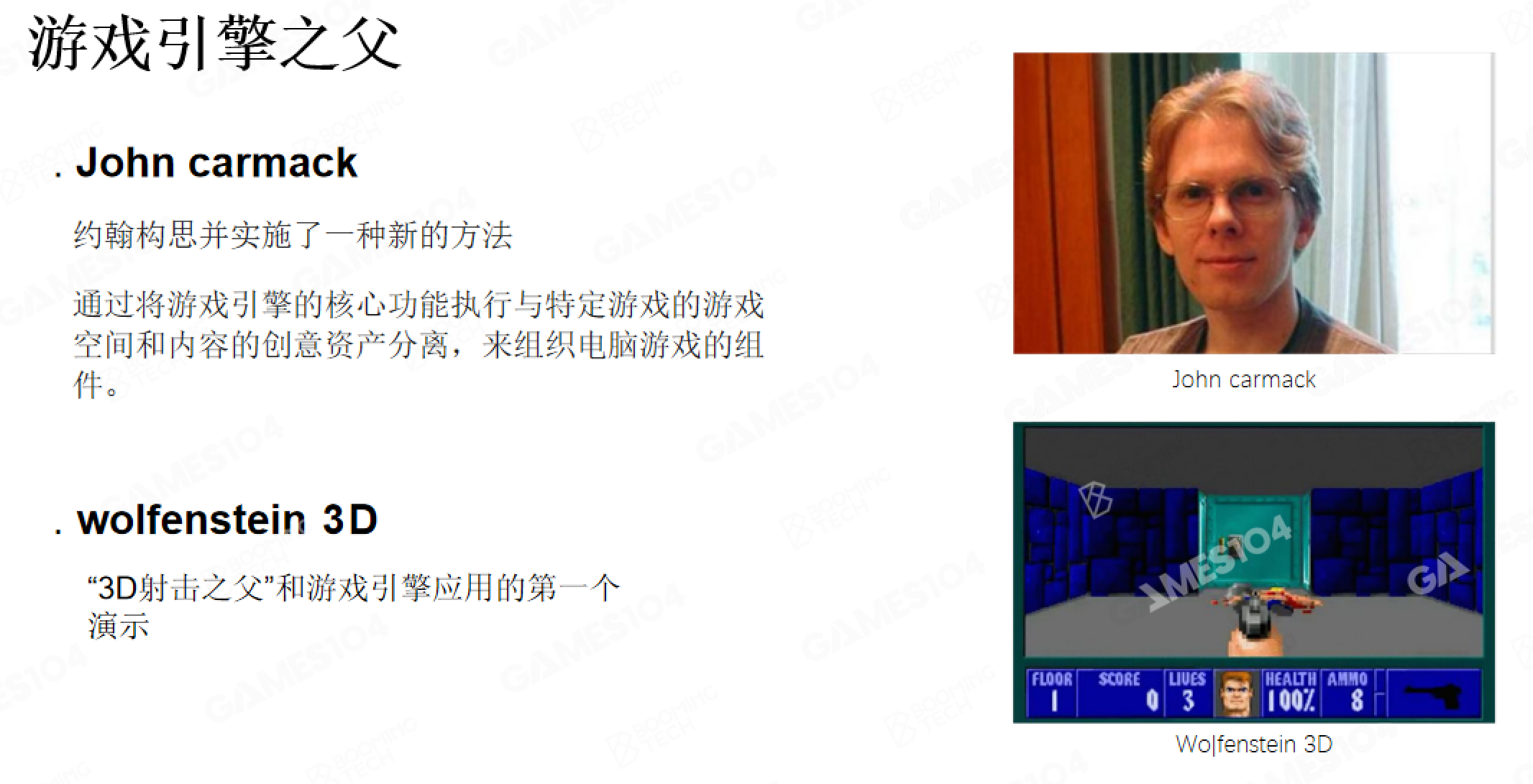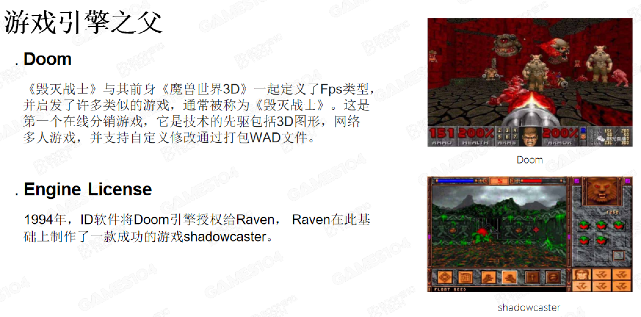 第一个游戏引擎雏形:约翰·卡马克(John Carmack)在开发首款FPS游戏《Wolfenstein 3D》时,首次尝试将游戏中可复用的核心功能(如渲染、输入控制)分离封装,奠定了游戏引擎的原始框架。后续其开发的《DOOM》进一步完善这一模式,将分离出的核心模块正式形成“DOOM引擎”,并通过授权给其他公司商业化,成功助力开发出《ShadowCaster》等作品,开启了游戏引擎的商业探索。