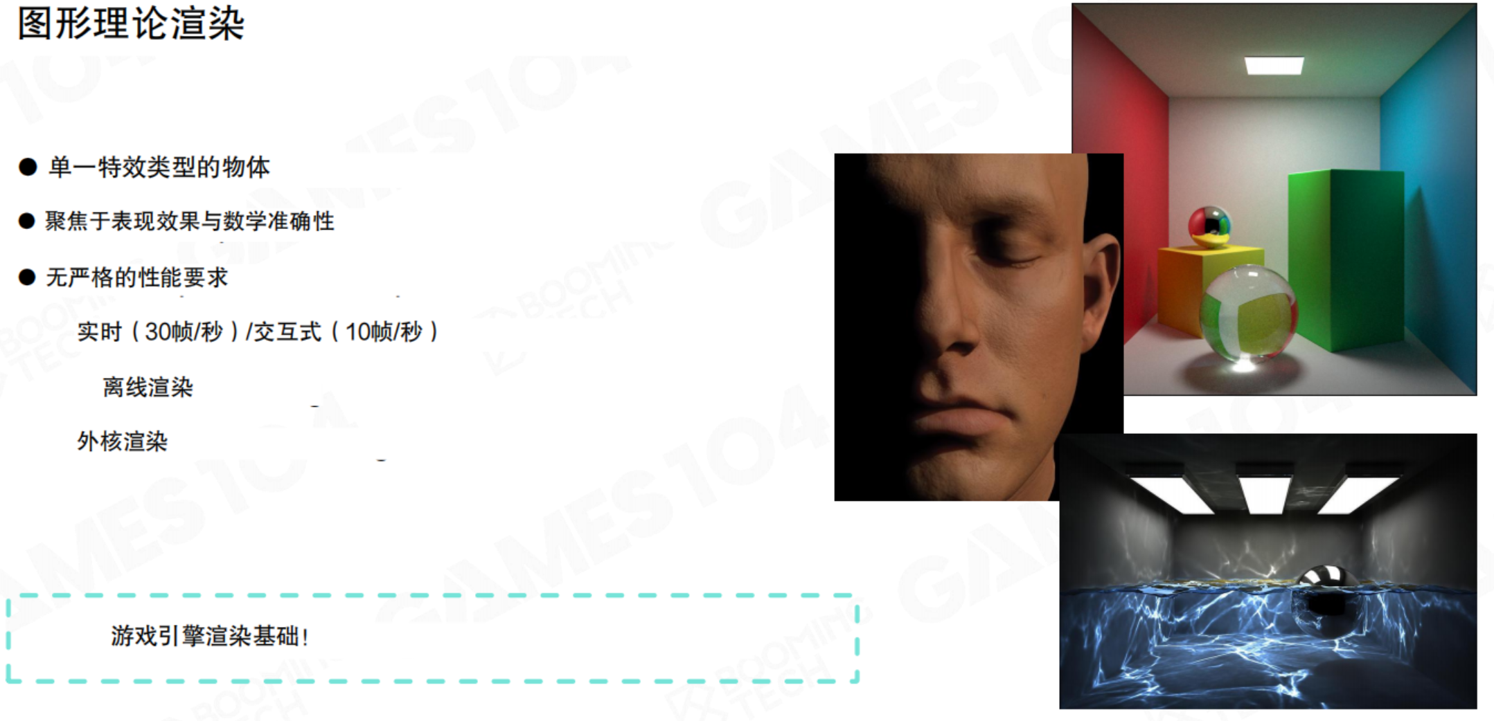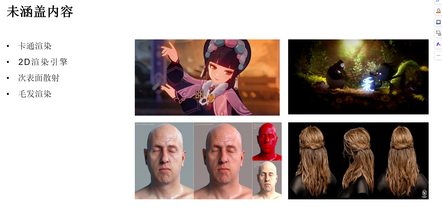 由于篇幅和重点所限,不会涵盖卡通渲染、专门的2D渲染引擎、次表面散射(如皮肤)、头发/毛发渲染等高级专题。