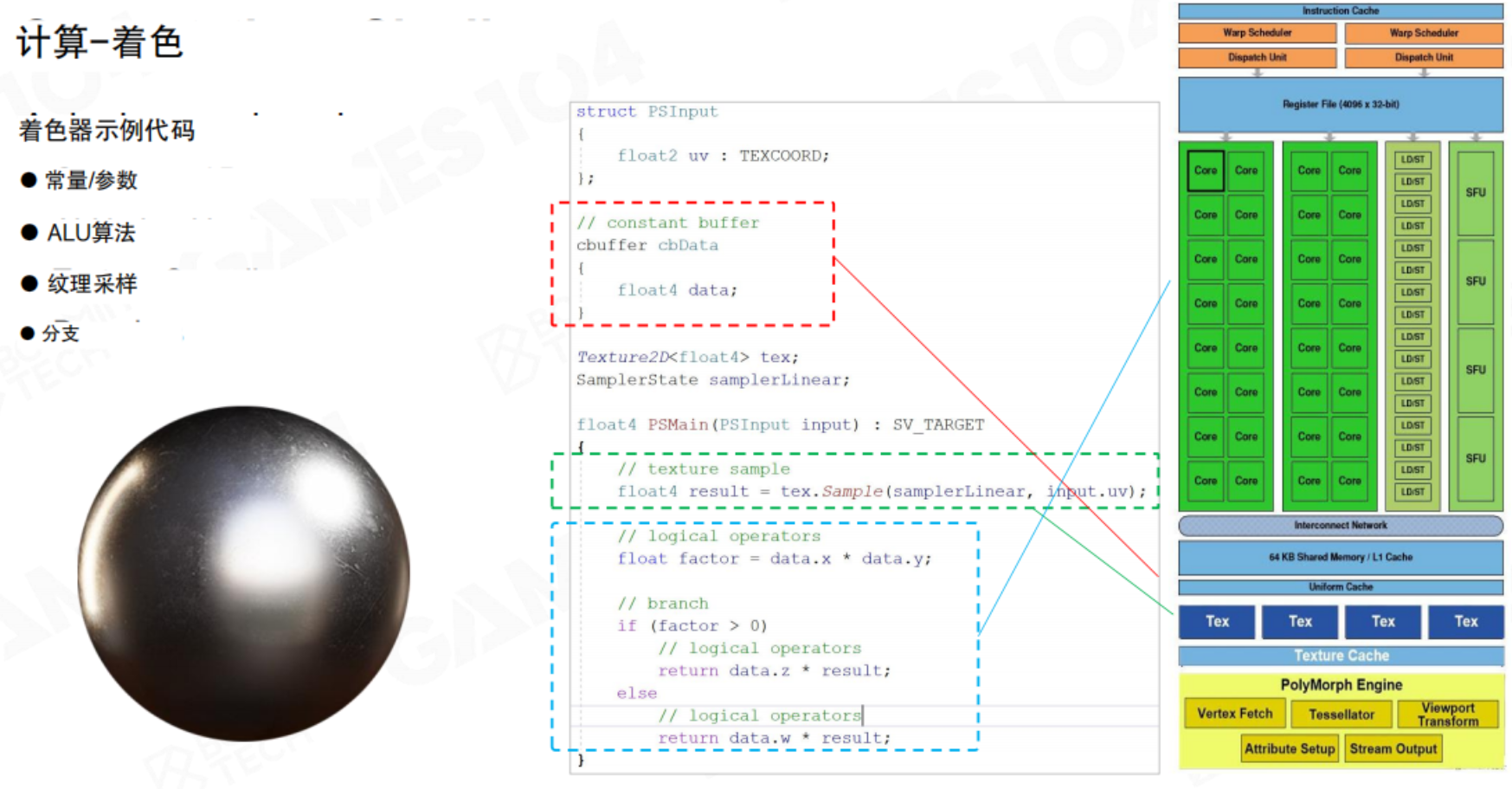 - ALU算法:算术逻辑运算,执行数学计算来模拟光照模型(如漫反射、镜面高光)。