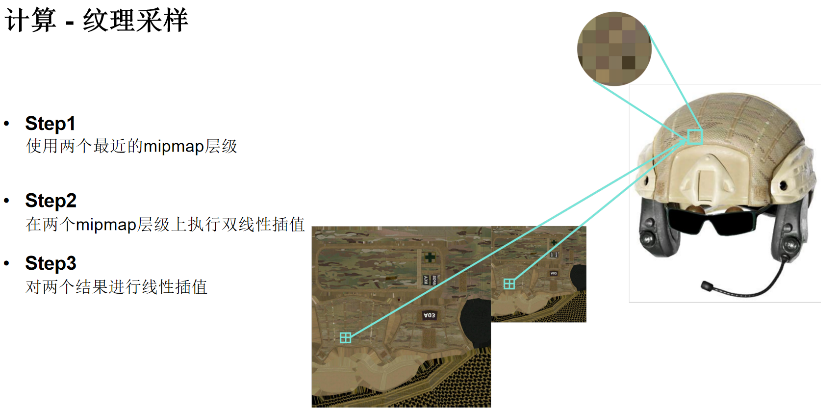 纹理采样不是简单的“取像素点”。为了在放大、缩小纹理时避免出现锯齿或闪烁等走样问题,需要进行复杂的滤波处理。一个高质量的纹理采样(如三线性过滤)通常包含三个步骤: