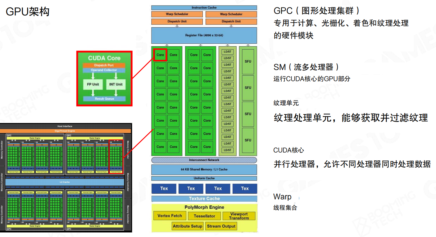 - SM(流多处理器):GPC的核心组成部分,负责执行CUDA核心(计算单元)的指令。大量SM的并行工作构成了GPU的强大算力。
