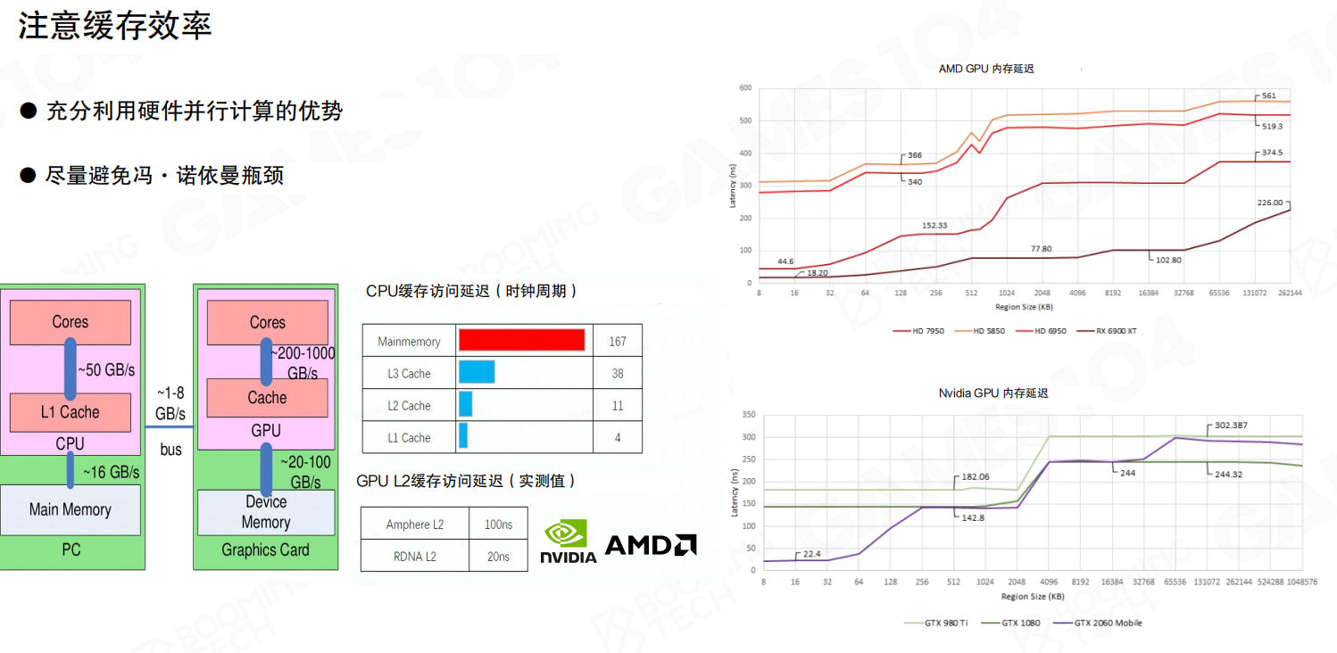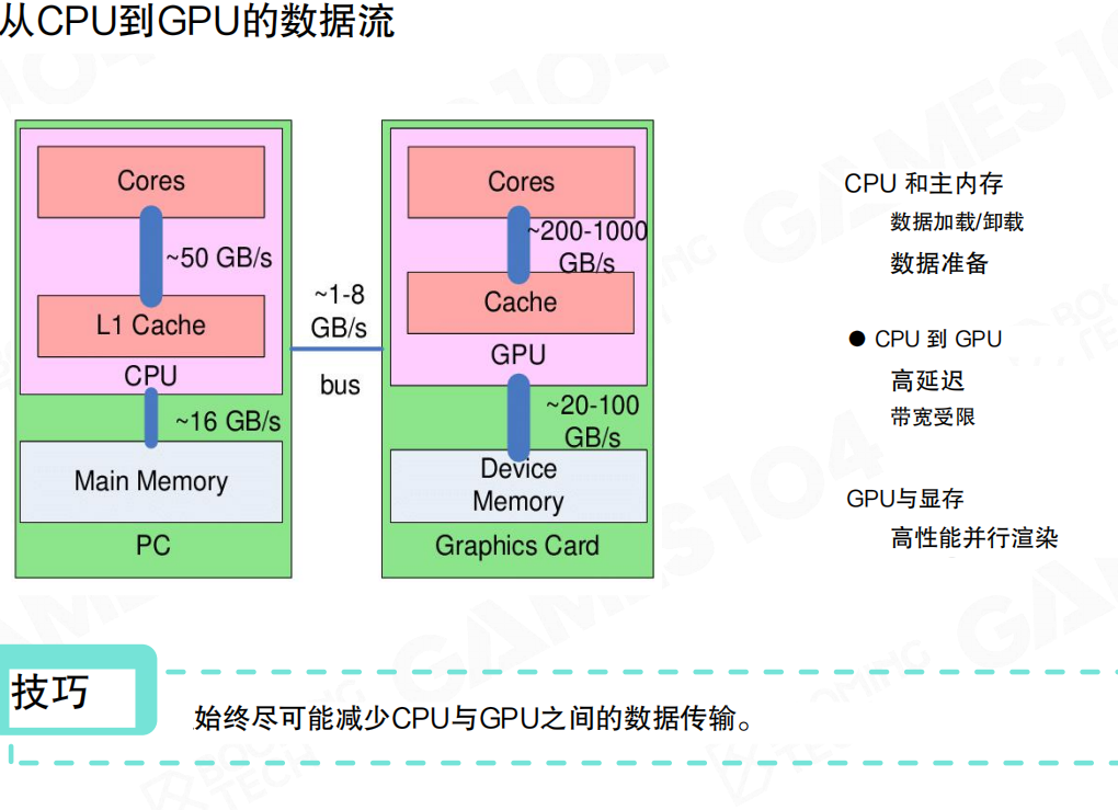 CPU和GPU可以看作是两台独立的“机器”,它们之间的数据通信(通过PCIe总线)具有高延迟、有限带宽的特点。。现代CPU的架构是冯诺依曼架构:数据与计算分离,这种架构的问题就是计算式需要准备好数据。因此,优化数据传输是渲染性能的关键。
