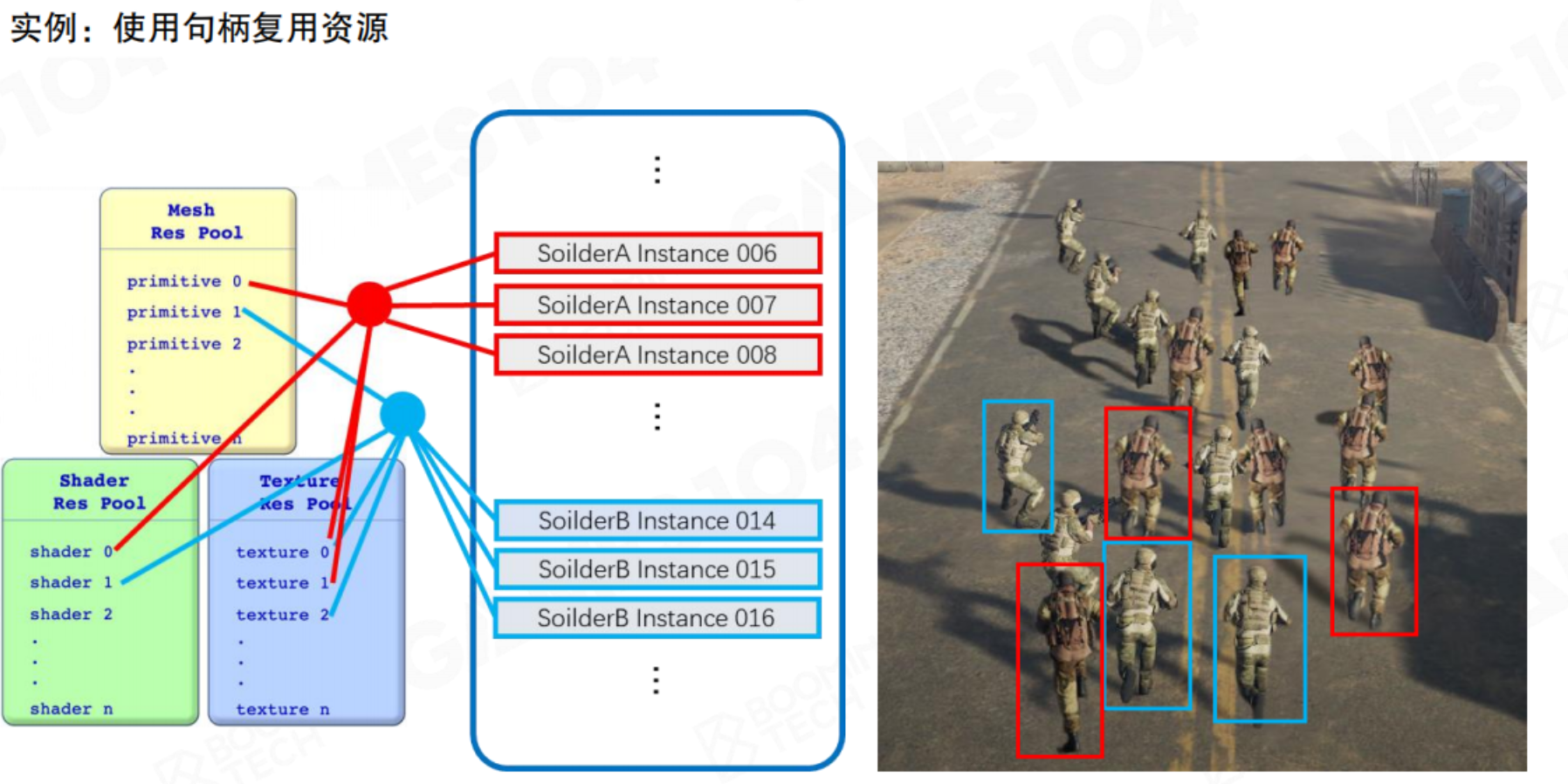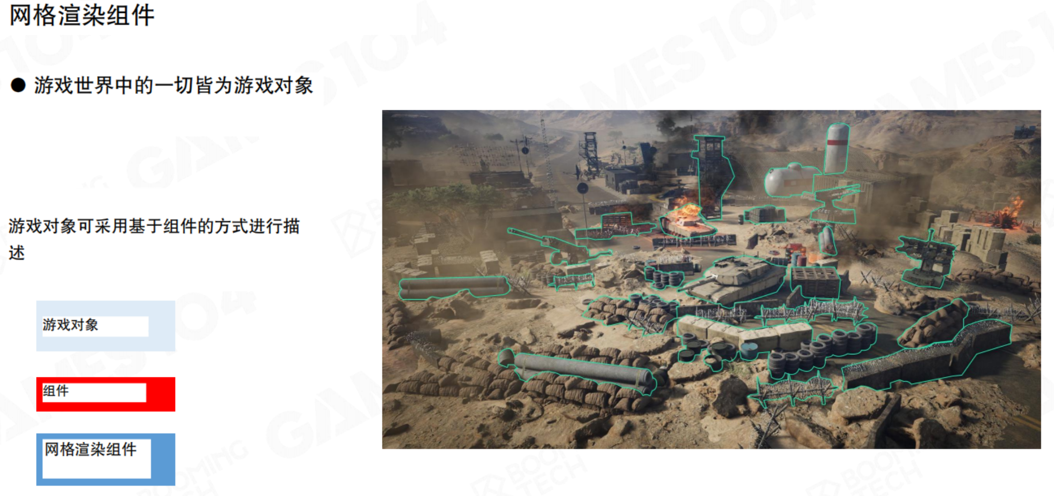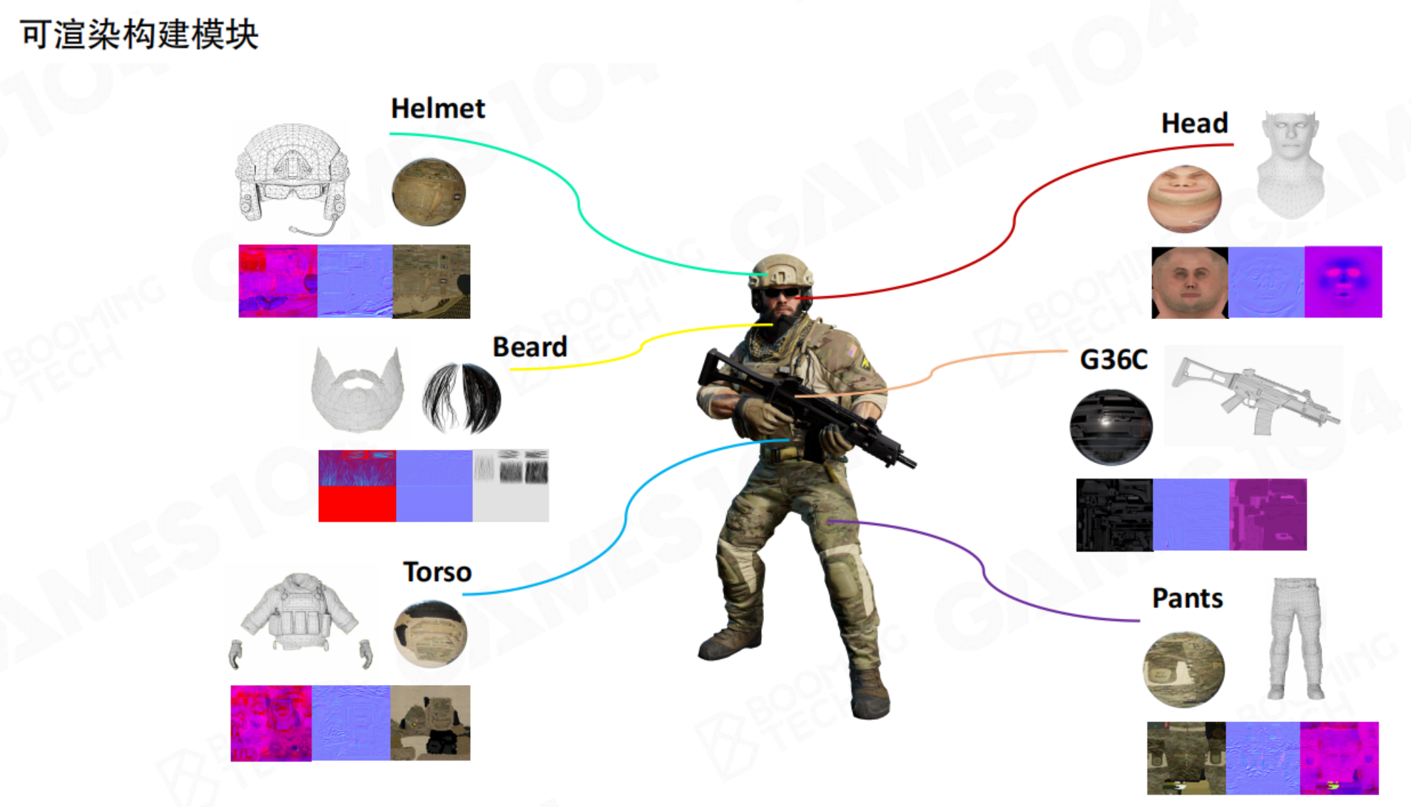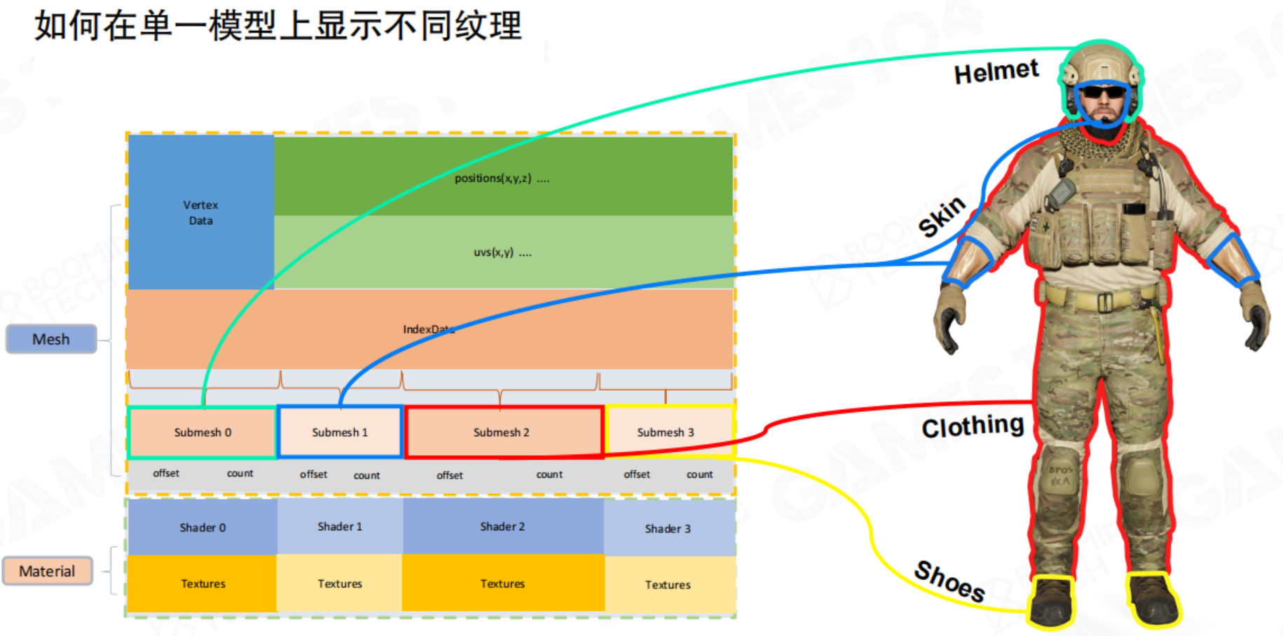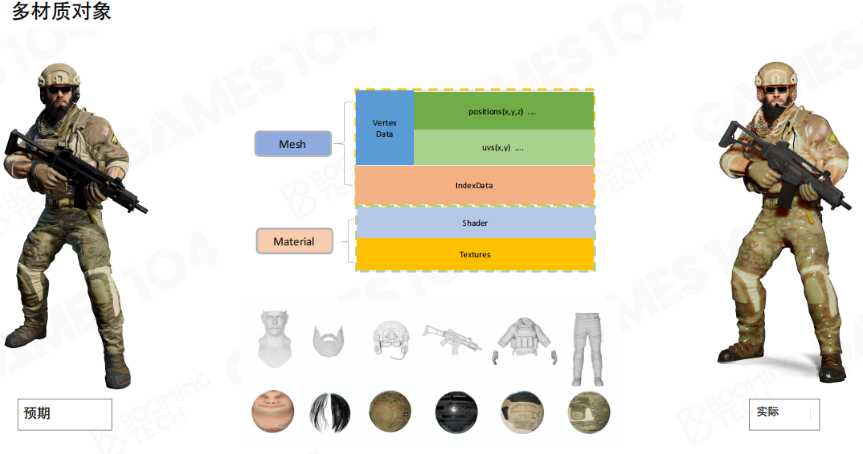 - 一个游戏对象可能会分成多个可渲染对象。以一个士兵为例,首先很多网格组成对象的框架;网格的质地各不相同,这就需要材质进行处理;材质中有不同的花纹,需要提供图片数据。