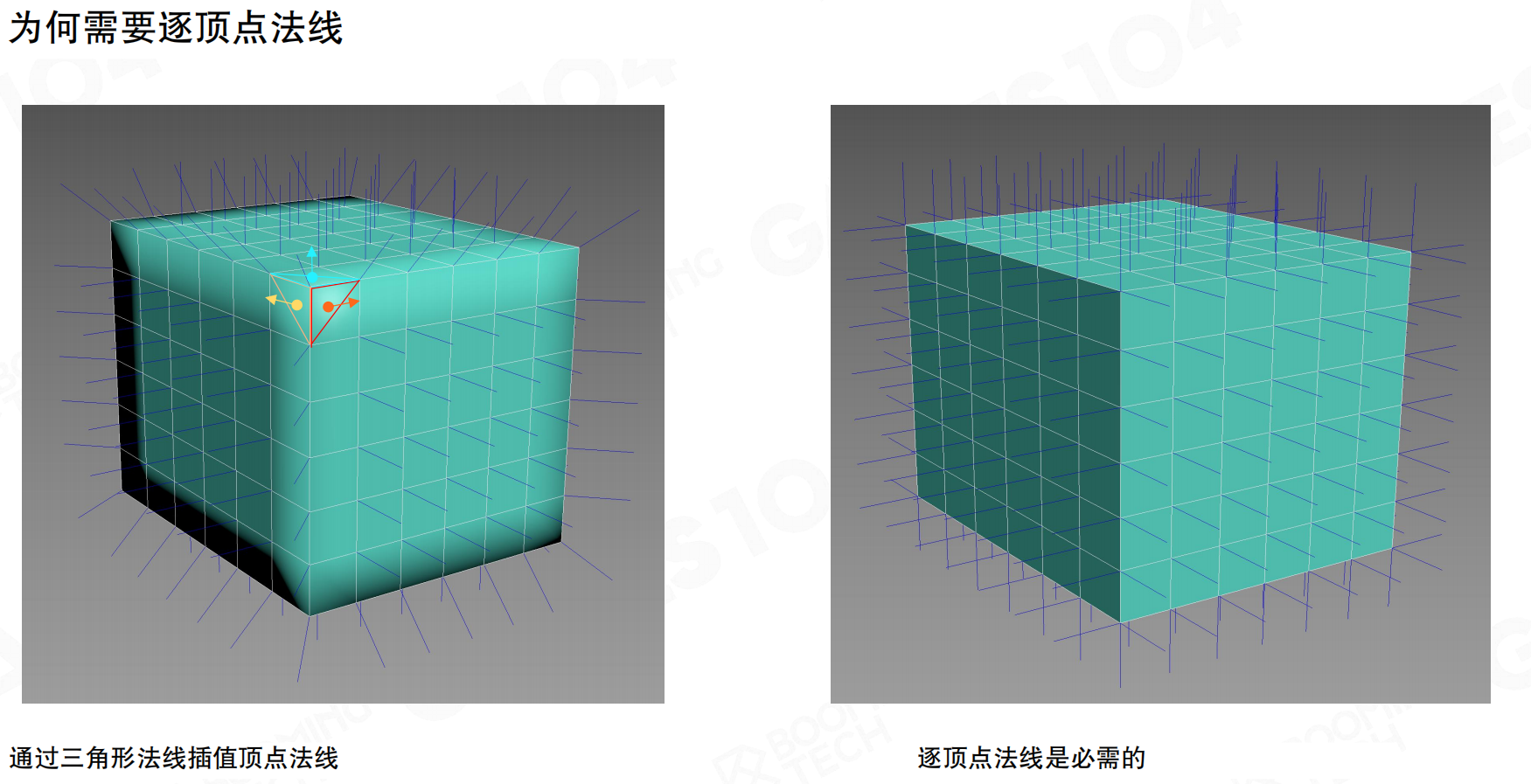为什么需要每顶点法线? 如果只使用面法线,在渲染平滑曲面(如球体)时会出现明显的棱角。通过为每个顶点存储法线(通常是在建模软件中计算的平均法线),并在光栅化阶段进行插值,才能得到平滑的光照效果。