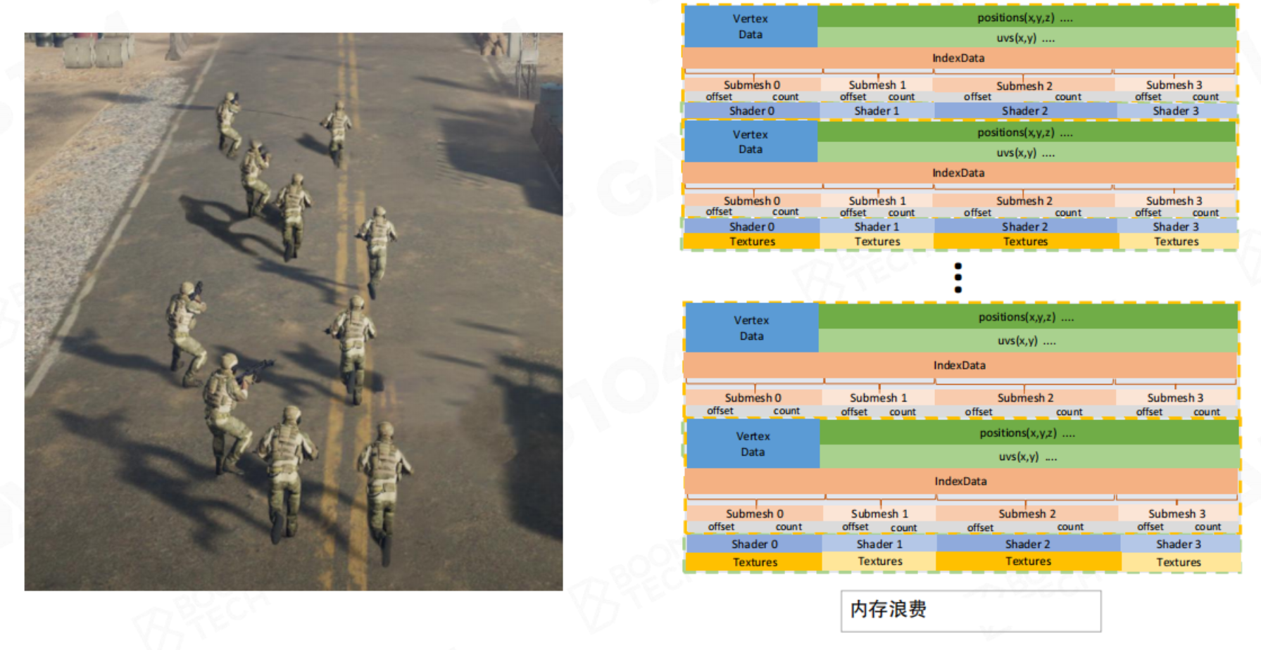 通过这种方式,将原本可能散乱无序的状态切换(如绘制一个沙袋后切换为墙体材质,再切换回来绘制另一个沙袋)转变为批次化的高效处理。尽管需要绘制的三角形总数不变,但通过极大限度地减少GPU的状态切换次数,使得GPU能够更持续、高效地运行,从而显著提升整体渲染性能。