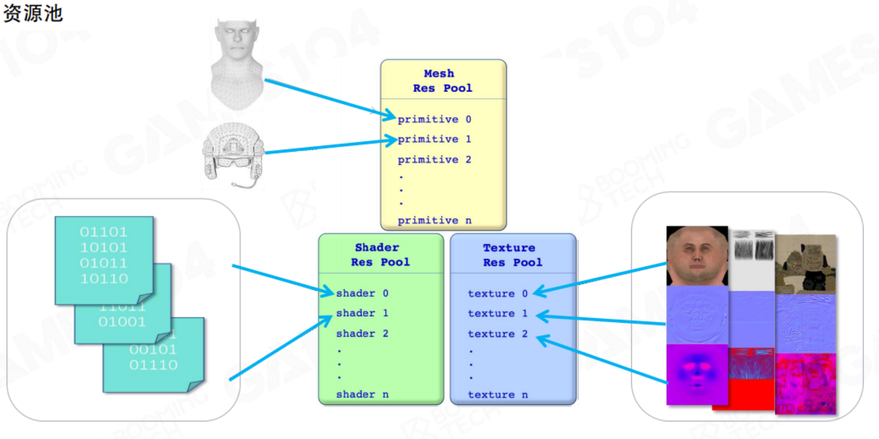 - 初始化资源池,准备模型与材质资源。