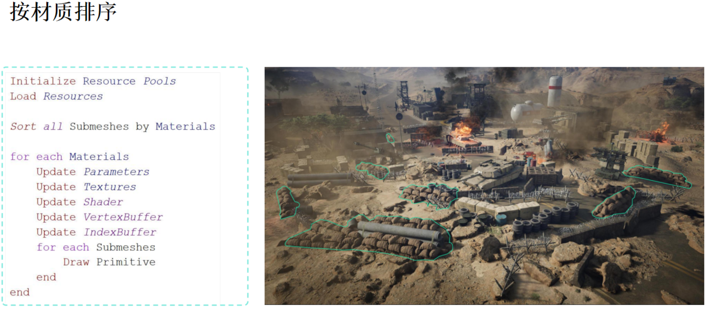 其核心逻辑如下:在提交渲染命令(Draw Call)之前,先将场景中的所有待渲染对象(子网格,SubMesh)按照其使用的材质进行归并与排序。如下图所示,场景中所有使用相同材质的物体(如沙袋、油桶等,均以青绿色轮廓标出)被识别为一组。