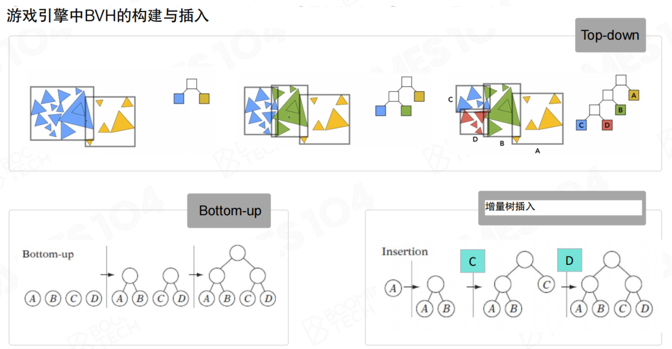 BVH(包围体层次结构):一种二叉树结构,每个节点存储一个包围体,包围其所有子节点包含的物体。从根节点开始遍历,如果某个节点的包围体不可见,其下所有子节点都可以快速剔除。BVH特别适合动态场景,因为物体移动时,可以增量式地更新树结构,而无需完全重建。(不仅要考虑剔除成本,还要考虑重构二叉树成本)