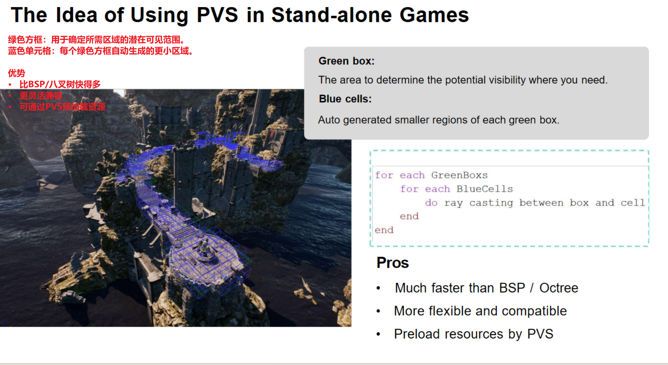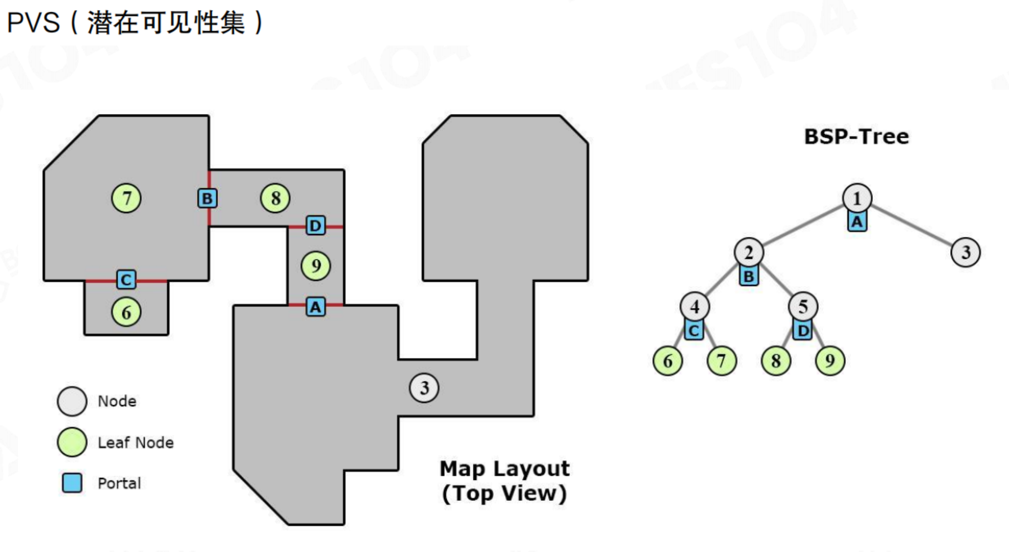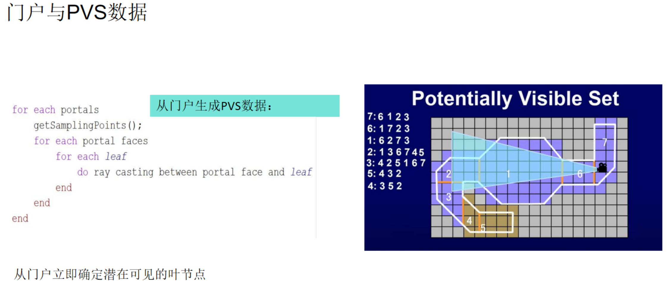 PVS(潜在可见集):常用于室内场景。将场景划分为多个区域(如房间),并预计算每个区域能直接看到哪些其他区域(通过门、窗等Portal)。运行时,根据玩家所在区域,直接加载并渲染其PVS内的区域,极大提升了效率。比如黑神话,过了一个门,可能就才去加载门后面的boss。