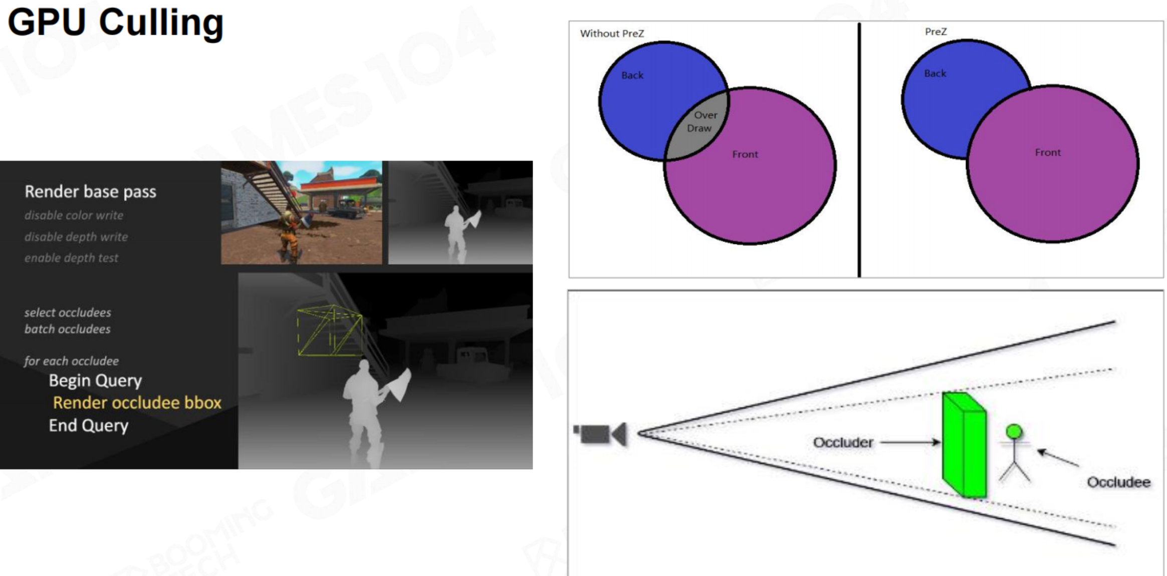 上图清晰地展示了两种协同工作的优化策略:GPU Culling(物体剔除) 和 Early-Z(早期深度测试),其核心哲学是“不绘制任何看不见的东西”。