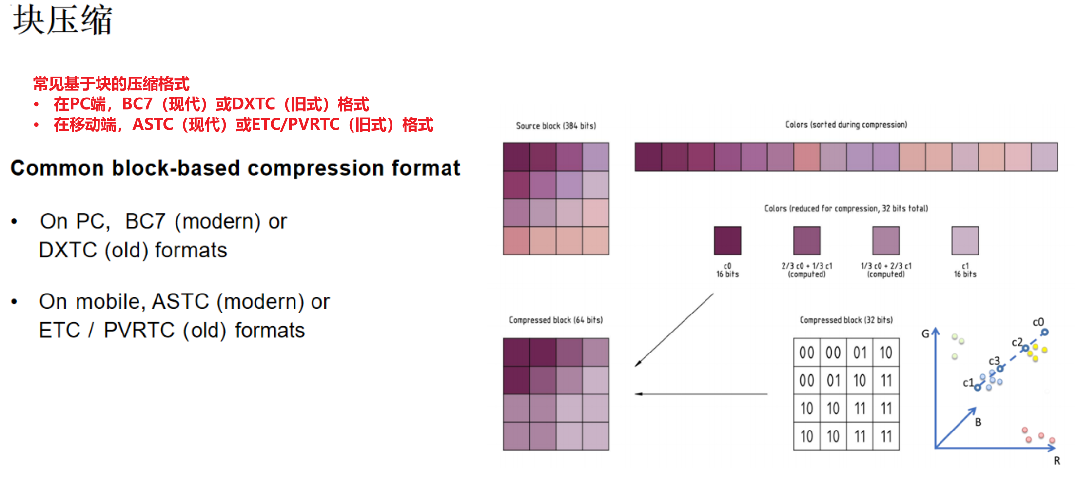 - 压缩时,算法会找到块内两个最具代表性的颜色(最亮与最暗)。