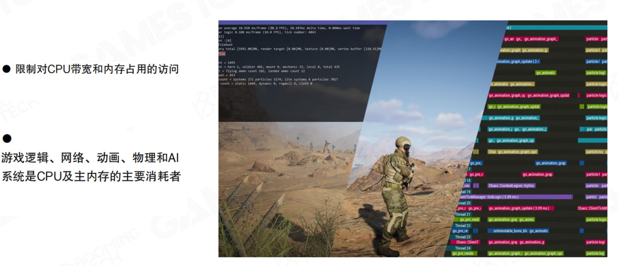 - 资源竞争挑战:CPU的算力和内存带宽是稀缺资源。渲染系统通常只能占用10%-20%的CPU资源,其余需留给游戏逻辑、AI、动画、物理和网络等系统。