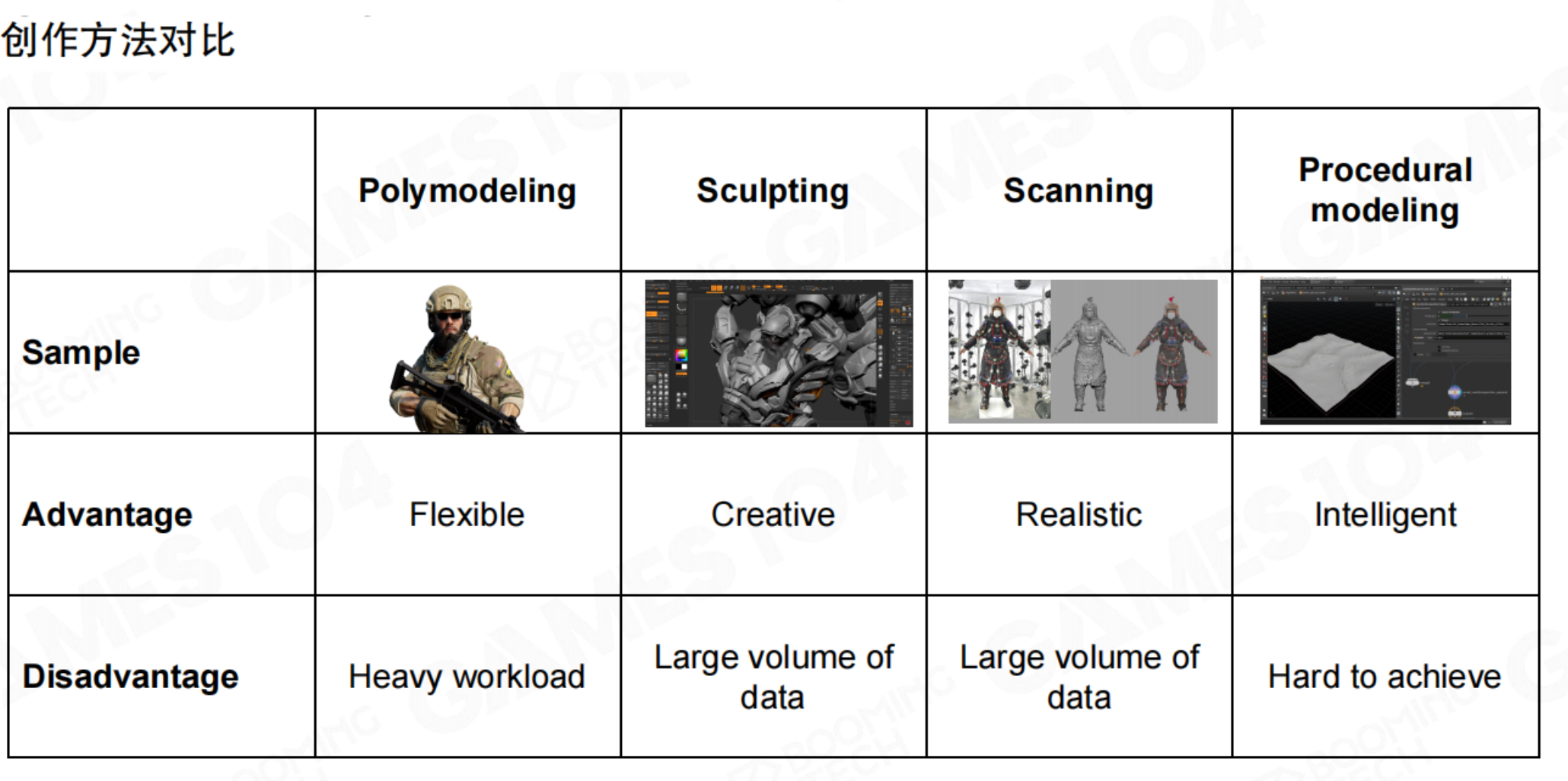 | 对比项 | 多边形建模 | 数字雕刻 | 扫描建模 | 程序化建模 |