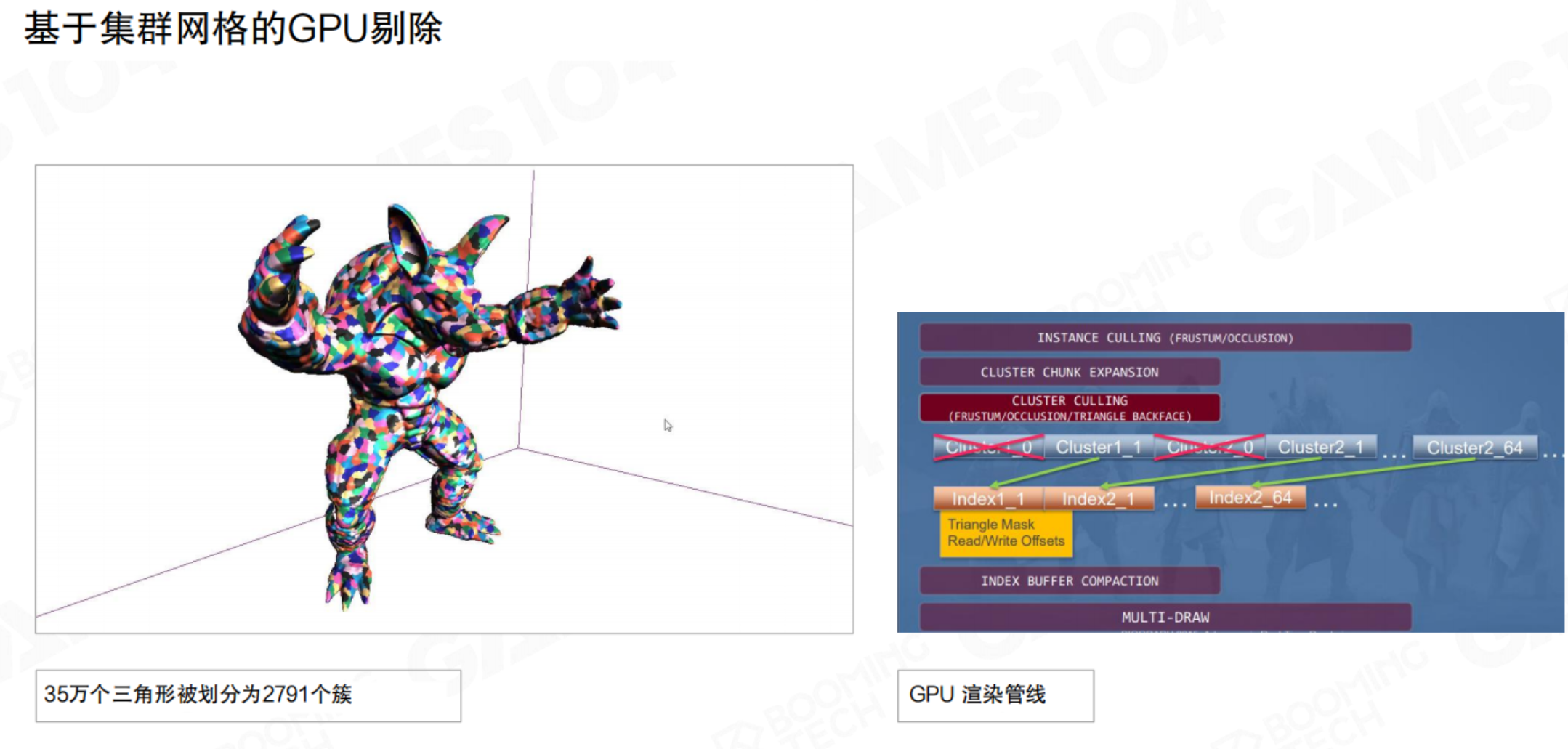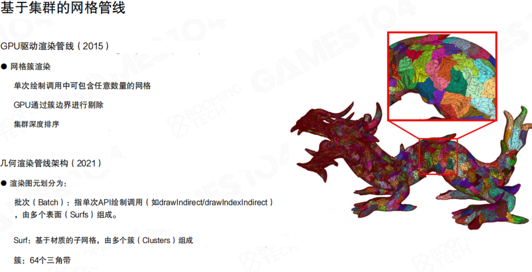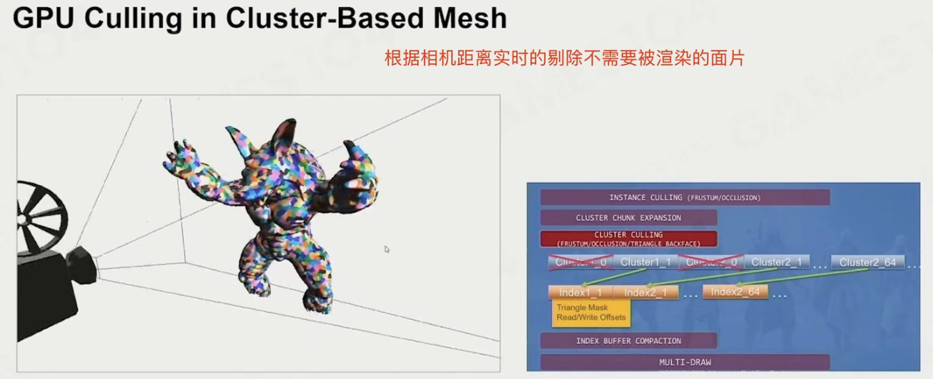 - 集群(Cluster):将模型的三角形网格预先分割成许多小的、固定三角形数量(如64或128个三角形)的集群(Cluster)。
