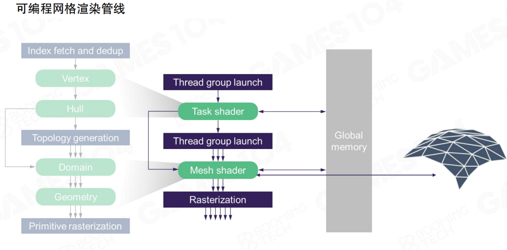 而现代网格管线(右侧流程)代表了根本性变革:它将几何的生成与处理重构为高度并行的GPU计算任务。其核心是两个新阶段: