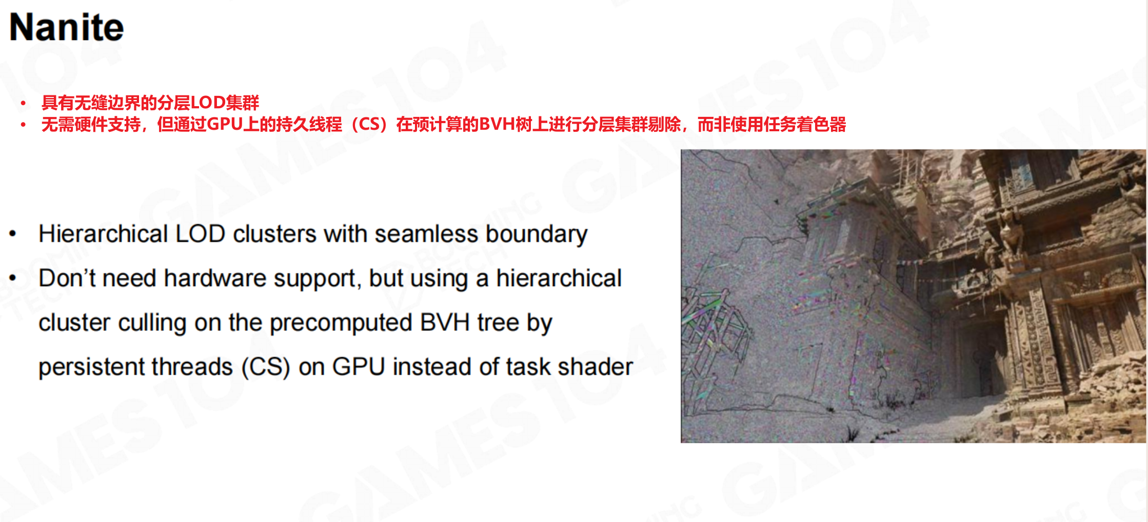 Unreal Engine 5的Nanite是此思想的集大成者。它不仅仅是软件算法,还结合了预先计算好的多层次细节的Cluster数据(包含BVH),使得引擎能够无缝流式加载和渲染拥有海量几何细节的场景,而无需手动创建LOD模型。
