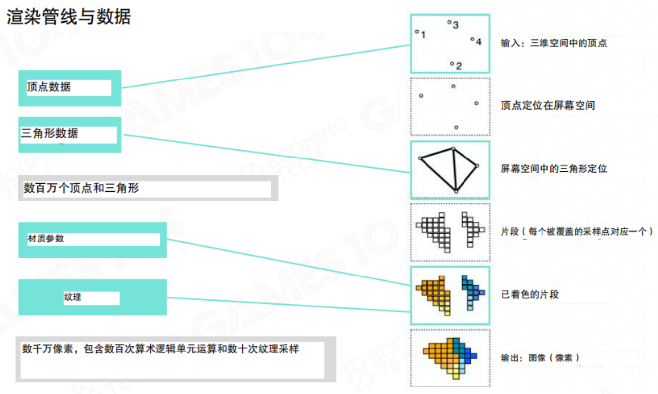 渲染过程可以看作一个有序的数据处理管线(Pipeline)。这个管线的输入是三维空间中的顶点数据,最终输出则是二维像素图像。